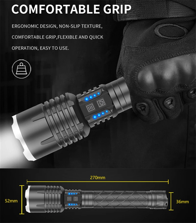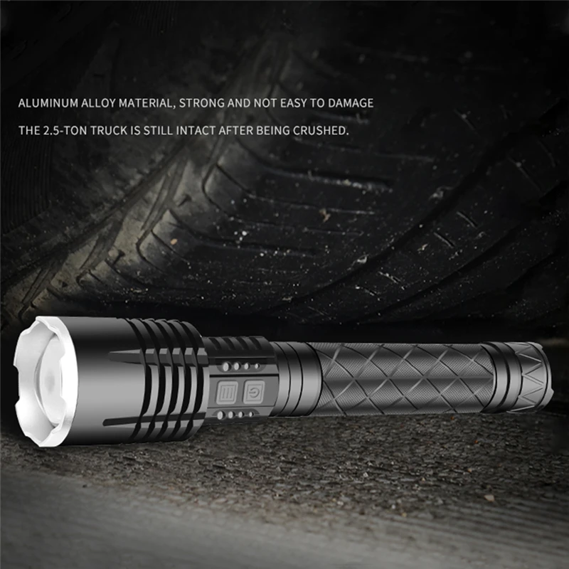 Светодиодный: XHP120 Размер изделия: 27*5,2*3,6 см Вес нетто: 414 г Материал: алюминиевый сплав Переключатель: переключатель режимов + функциональный переключатель Батарея: 2*26650/2*18650 батареи (опционально) Метод зарядки: usb-зарядка Type-c, поддержка ввода и вывода Рабочий режим: 1. Переключатель режима: низкий светильник-средний Светильник-сильный светильник 2. Функциональный переключатель: 2 шестерни, супер яркий-мигающий стробоскоп, Длительное нажатие на любой передаче, чтобы выключить светильник. Метод масштабирования: телескопический зум Люмен: 3000-3500 люмен Светильник индикатора: индикатор заряда батареи справа, положение яркости/передачи слева Характеристики: вход и выход, дисплей питания, с хвостовой веревкой