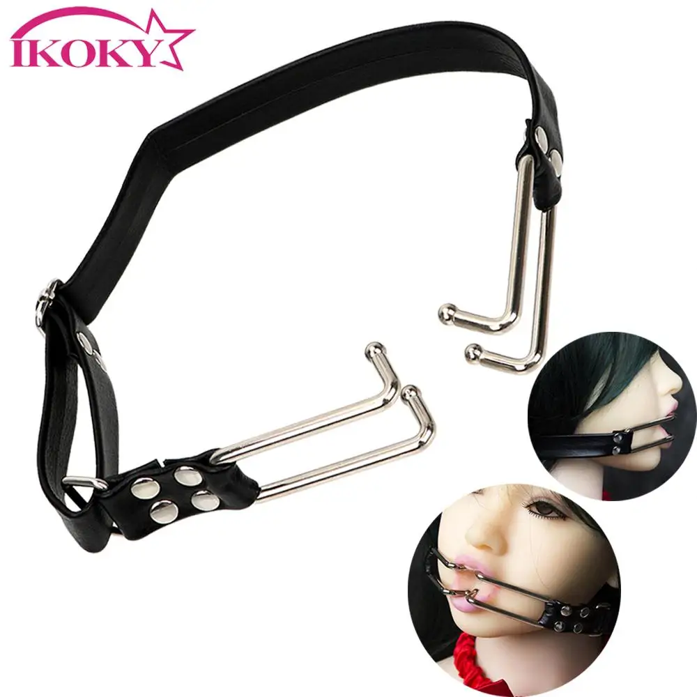 IKOKY стальной кляп открытый крючок оральная кожа укусы пары флирт, Фетиш SM бондаж эротические интимные изделия игрушки портупея игры для взрослых