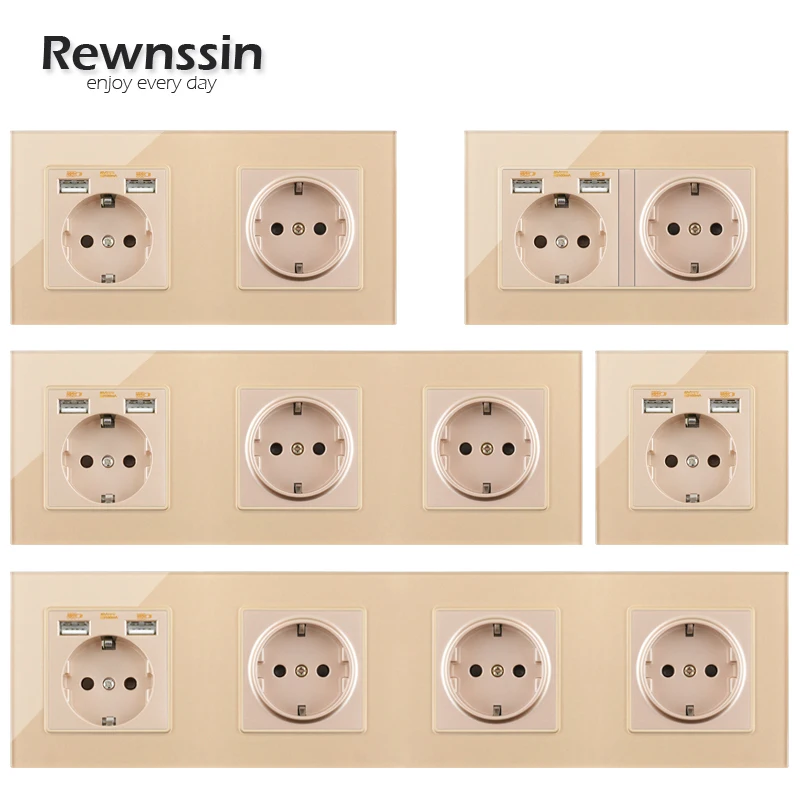 Вилка USB, Золотая прозрачная стеклянная панель Singel, двойная Тройная четырехстенная розетка, тройная розетка европейского стандарта, Электророзетка