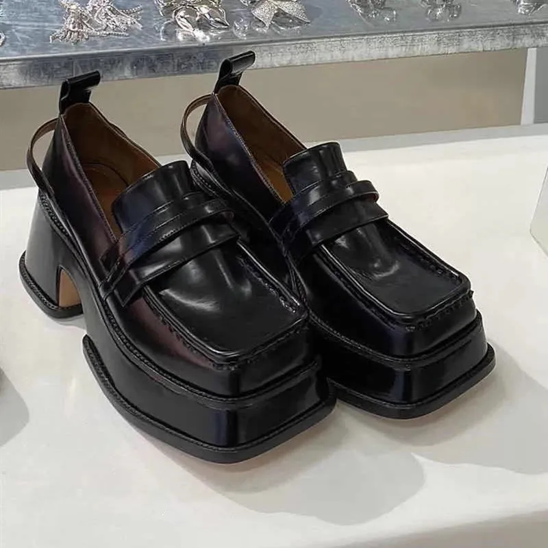 Женские туфли на плоской платформе; Водонепроницаемые лоферы из искусственной кожи в стиле ретро с квадратным носком; Тонкие туфли для женщин с черным ремешком на каблуке 6 см