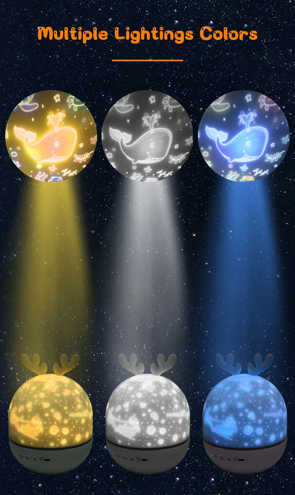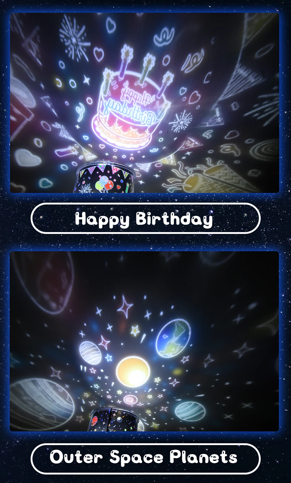 * [Ночсветильник-проектор (набор) и музыкальная шкатулка (набор B)] этот детский ночсветильник-это не только ночник, но и Ночной проектор, И музыкальная шкатулка (набор без музыки). В нашу прикроватную лампу встроены 8 мягких песен (набор B), вы можете переключать ее, устанавливать громкость вверх/вниз по желанию своих детей. Дети смотрят проецируемую сцену, слушают мягкие звуки, Это успокоит свои эмоции и быстро уснет. Больше не боретесь со сном!* [Встроенный динамик HD Bluetooth (набор C)] кроме того, он имеет внутренний динамик Bluetooth, который создает успокаивающую среду, просто подключите его к своему устройству Bluetooth, например к телефонам, колодки, наслаждайтесь фантастической проекцией и музыкой!* [Сменные пленки] «пленка» ночсветильник легко устанавливается и снимается. Есть яркие и красочные темы, в том числе: Планетная Вселенная, морской мир, звездное небо, романтический любовник, день рождения, Рождество и т. д. Используйте его, чтобы украсить стену и потолок, обогатить жизнь детей.* [Пульт дистанционного управления и зарядка через USB] больше не нужно вставать с кровати или дивана, чтобы включить/выключить свет. Вы можете включать/выключать детский ночсветильник-проектор, регулировать цвет света, переключать песни, яркость, легко устанавливать таймер и вращаться через пульт дистанционного управления (комплект без пульта дистанционного управления). Наш ночник поставляется с USB-кабелем для зарядки, не нужно беспокоиться о мощности. Наборы B и C оснащены перезаряжаемыми батареями, что делает их портативными и простыми в использовании.* [Лучшие подарки для ваших детей] не можете выбрать, что купить детям на день рождения, Рождество или другие подарки для особых случаев? Сразу же получите этот ночсветильник-проектор. Это будет замечательная игрушка для девочек/мальчиков, чтобы развить свое воображение и творческие способности. Это поможет ей или ему преодолеть страх в темноте и принесет малышу тепло и счастье.