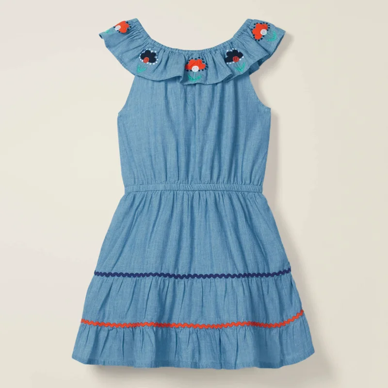 Детское джинсовое платье с длинным рукавом, круглым вырезом и цвето...