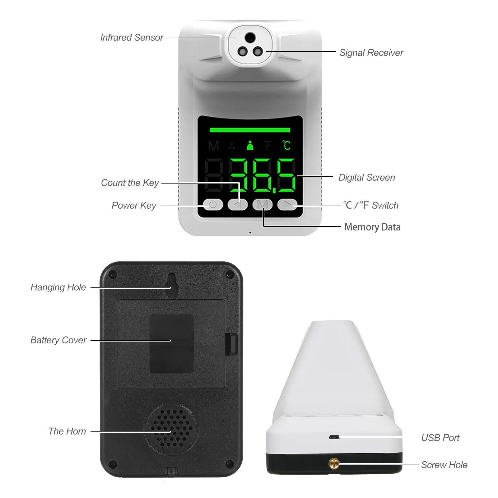 Пожалуйста, обратите внимание, что указанный Товар производится и распространен за рубежом и в соответствии с законодательством страны его происхождения. Настенный Бесконтактный инфракрасный термометр может измерять температуру в пределах 1-10 см от лба в пределах 1 с, надежное и Точное отображение показаний на экране. Цельсия и Фаренгейт могут быть переключены. Он также поддерживает на каждый день, 3 цвета индикатор светильник функция сигнала тревоги. Он может быть установлен на стене или поддерживается штативом и может широко использоваться в домашних условиях, офисах, гостиницах, торговых центрах, супермаркетах, школах, ресторанах, железнодорожных станциях, фабриках и других общественных местах. Особенности: Бесконтактное измерение: Бесконтактный инфракрасный термометр, вам нужно только стоять на расстоянии 1-10 см перед термометром. Избегайте прикосновения к коже, более здоровой и безопасной. Точный и надежный: термометр для лба оснащен передовой инфракрасной технологией и высокоточным датчиком для получения достоверных и точных показаний в пределах 1 с. Переключаемый блок °C и °F: Этот инфракрасный термометр на лбу может отображать показания по Цельсию или по Фаренгейту. Диапазон измерения: 32 °C-43 °C/89,6 °F-109,4 °F. 3 способа питания: 3 батарейки типа АА (не входят в комплект) или 1 аккумулятор 18650 или 5 в постоянного тока 1A вход через usb-кабель, три способа питания отвечают различным требованиям. Гибкая установка: три режима установки поддерживаются. Его можно разместить на штативе или зафиксировать на стене с помощью крючка или двусторонней ленты. Широкое Применение: Широко используется дома или на заводах, офисных зданиях, супермаркетах, ресторанах, школах, железнодорожных станциях и других общественных местах. Характеристики: Цвет: белый Материал: АБС-пластик Режим измерения: Бесконтактный Место измерения: лоб Расстояние измерения: 1-10 см Время отклика: 1S Диапазон измерения: 32 °C-43 °C/89,6 °F-109,4 °F Точность измерения: ± 0,2 °C Дисплей: Цельсия (°C) /Фаренгейт (°F) Источник питания: USB DC 5 В или 3 * AA батареи (не входят в комплект) или 1*18650 батареи (не входят в комплект) Функция сигнализации: 32-37,2 ℃ (зеленый светильник), 37,3-37,7 ℃ (оранжевый светильник и сигнализация), 37,8-43 ℃ (красный светильник и сигнализация) Функция памяти: 50 наборов показаний температуры истории Продукт Размеры: 150*100*116 мм/5,9*3,9 * 4.6in Посылка Размеры: 155*124*107 мм/6,1*4,9 * 4.2in Вес посылка: 290 г/10,2 унций Посылка: 1 * термометр 1 * Руководство пользователя 1 * USB кабель 1 * набор аксессуаров