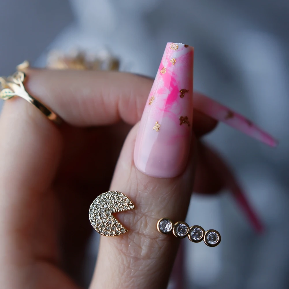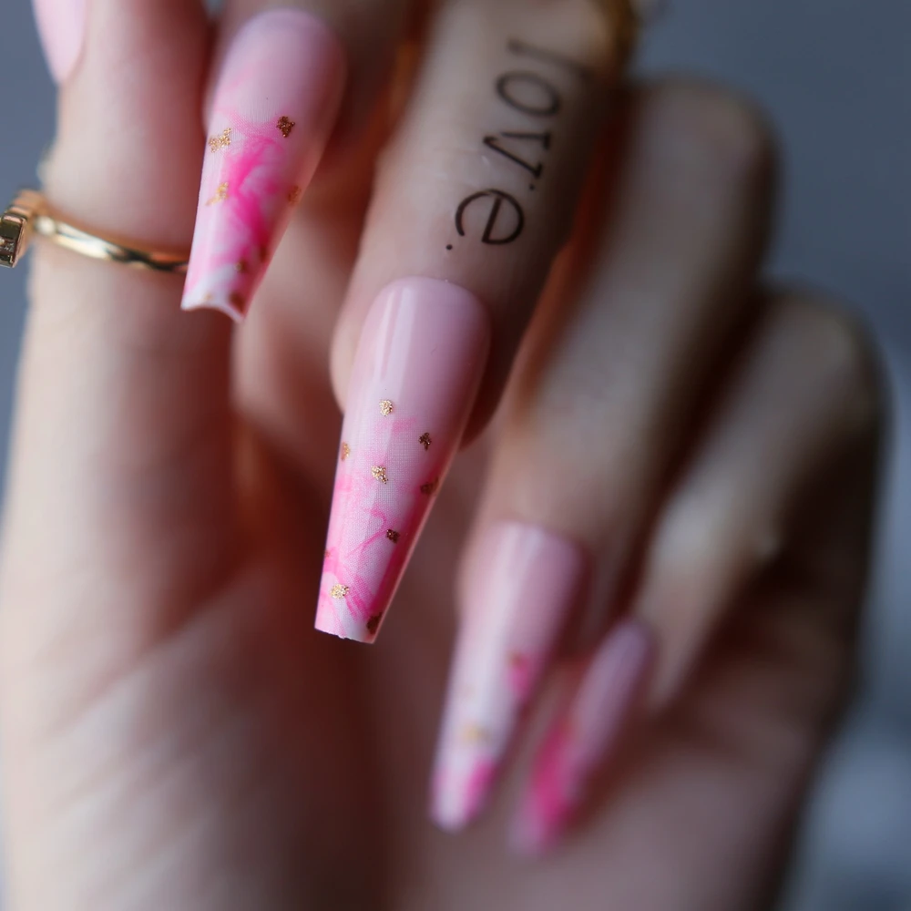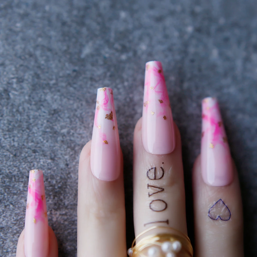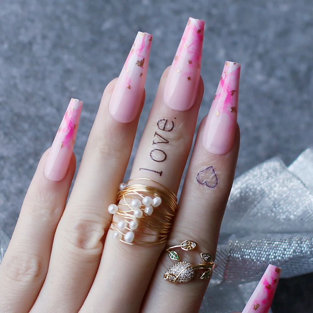 Роскошные розовые гвозди с эффектом омбре, размер XL, акриловые гвозди, цветущие поддельные гвозди из золотой фольги, глянцевые, повторное использование, полный набор, 24 шт.