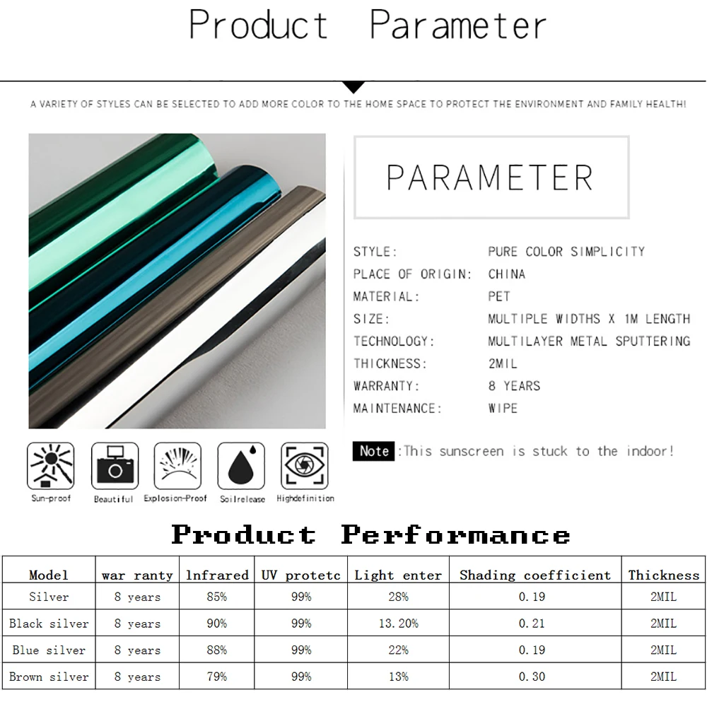 Цвет: серебристый Размер: 40/50/60x200 см Тип: виниловый самоклеящийся Функция: теплоизоляция, защита от УФ-лучей, защита конфиденциальности, защита от взрыва Посылка входит: солнечная пленка и инструмент для установки Новый тип солнечной пленки-это высококачественная зеркальная оконная пленка, предназначенная для применения на строительных окнах. Неклейкий оттенок окна обеспечивает отличную конфиденциальность в течение дня, так как снаружи он становится ярче. Зеркальная защитная оконная пленка не обеспечивает конфиденциальность ночью при включенном свете внутри дома. Он обеспечивает 78% Снижение тепла и блокирует до 98% вредных УФ-лучей, уменьшая при этом тепло, отражая солнечные лучи снаружи летом и сохраняя тепло внутри зимой, обеспечивает комфортное ощущение дома или офиса каждый день.