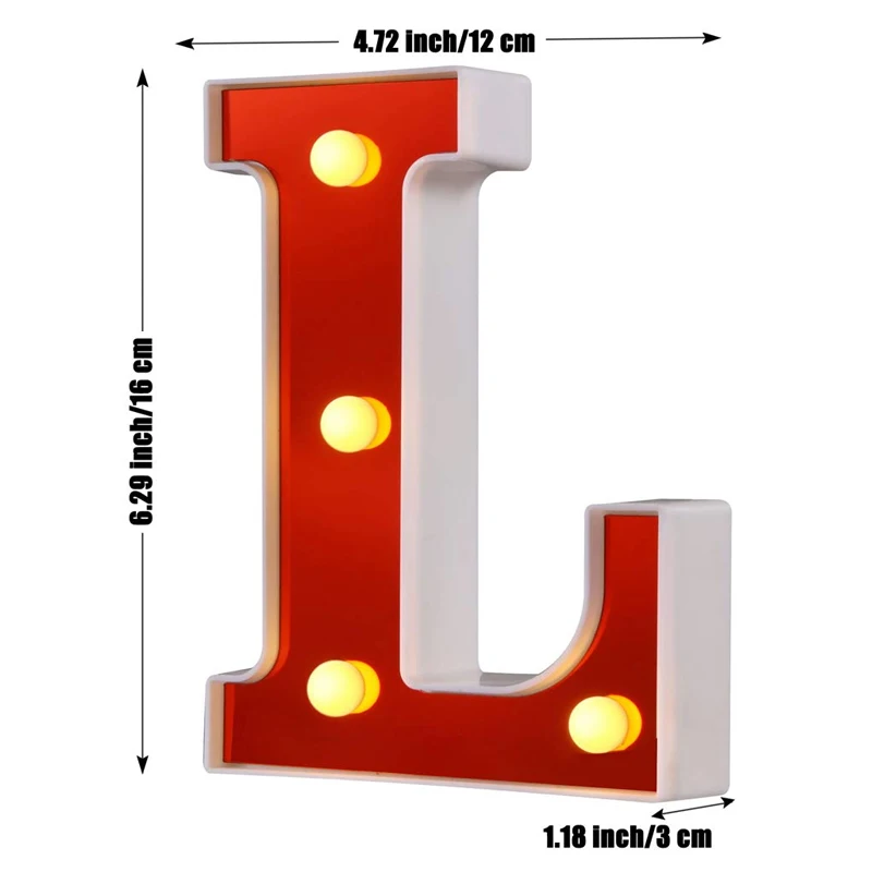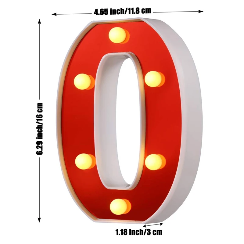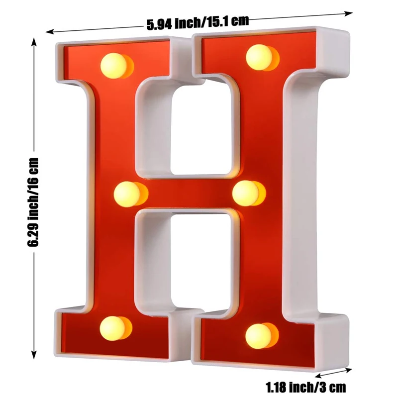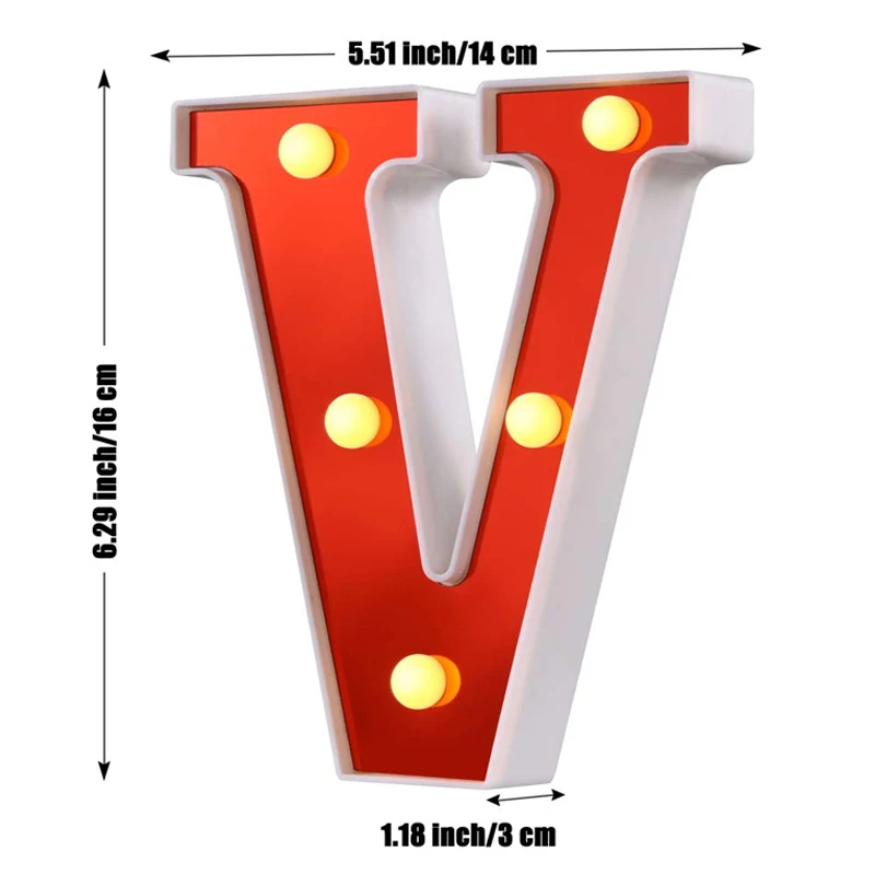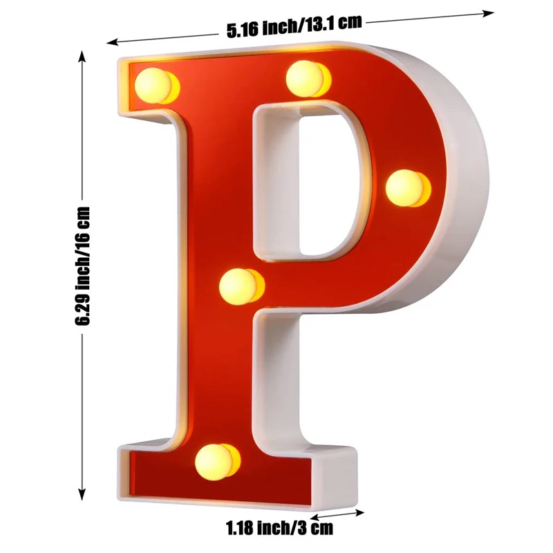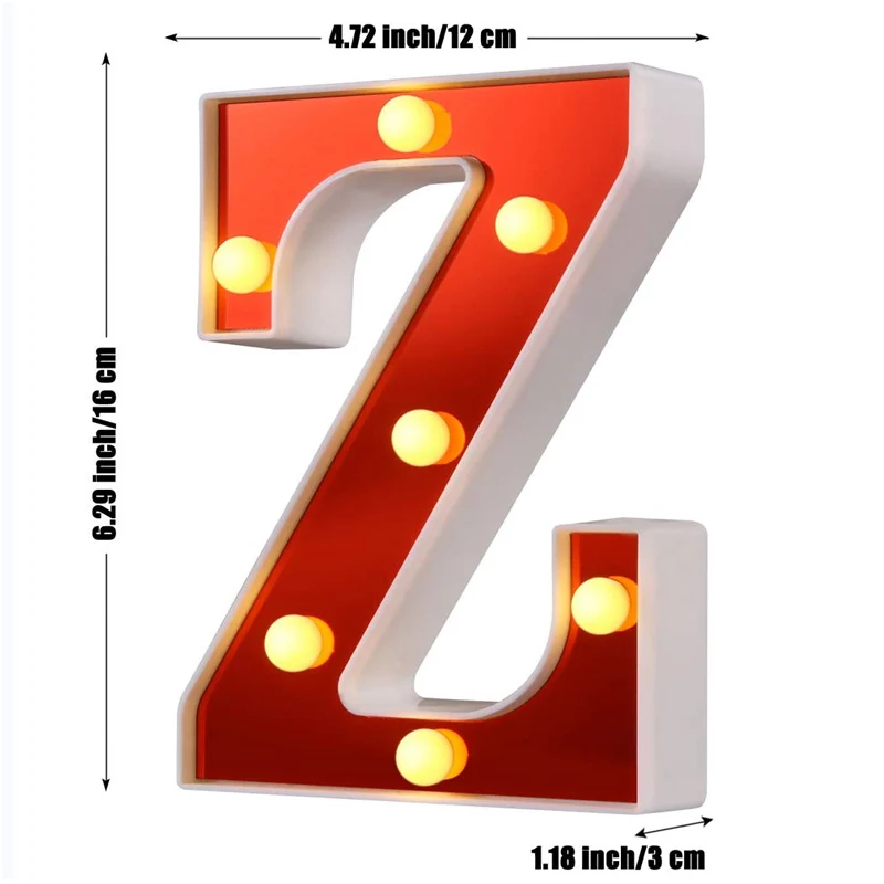 Изготовлен из пластика,Требуется 2 батарейки AAA, Высота букв 16 см, толщина 3 см, ширина в соответствии с размером буквы максимум 17,5 см, минимальная буква см