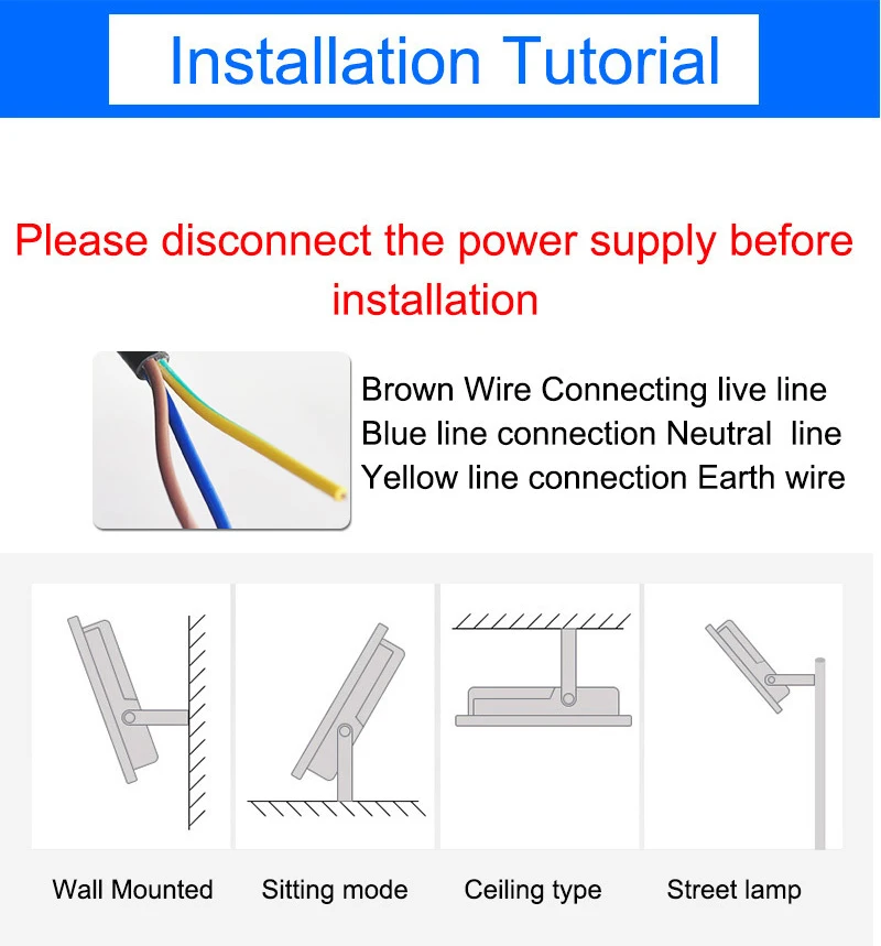 Наш продукт изготовлен из высококачественных чипов. Высококачественный АБС абажур с высоким коэффициентом пропускания. Наш светодиодный светильник эквивалентен 300 Вт галогенной лампе. Прожектор также экономит 80% вашей энергии по сравнению с традиционными галогенными лампами. Осветите вашу атмосферу нашим светодиодный прожектором!