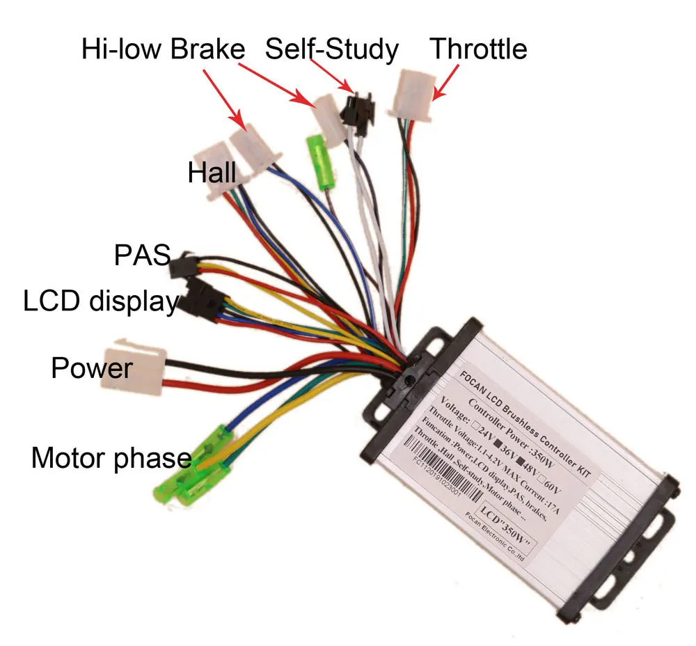 Бесщеточный контроллер двигателя постоянного тока контроллер электровелосипеда + ЖК-дисплей SW900 один комплект (Этот контроллер работает только с бесщеточным двигателем постоянного тока)Схема подключения дроссельной заслонки:Красный + 5 В Зеленый сигнал черная земляОсобенности:1) Номинальное напряжение: 24 В постоянного тока/в2) Номинальная мощность: 250 Вт, 350 Вт3) Максимальный ток: >13 а 17 а4) защита от пониженного напряжения: 20/30/40 В +-0,5 В5) ограничение по току: 13 а 17 а6) эффективность: ≥ 83%7) Потребление: <1,5 Вт8) категория контроллера: Бесщеточный постоянный ток9) Применимая Модель: электрический велосипед, электрический скутер, Электромобиль, игрушечный скутер и т. Д.