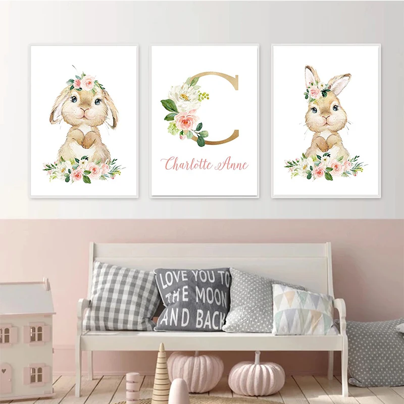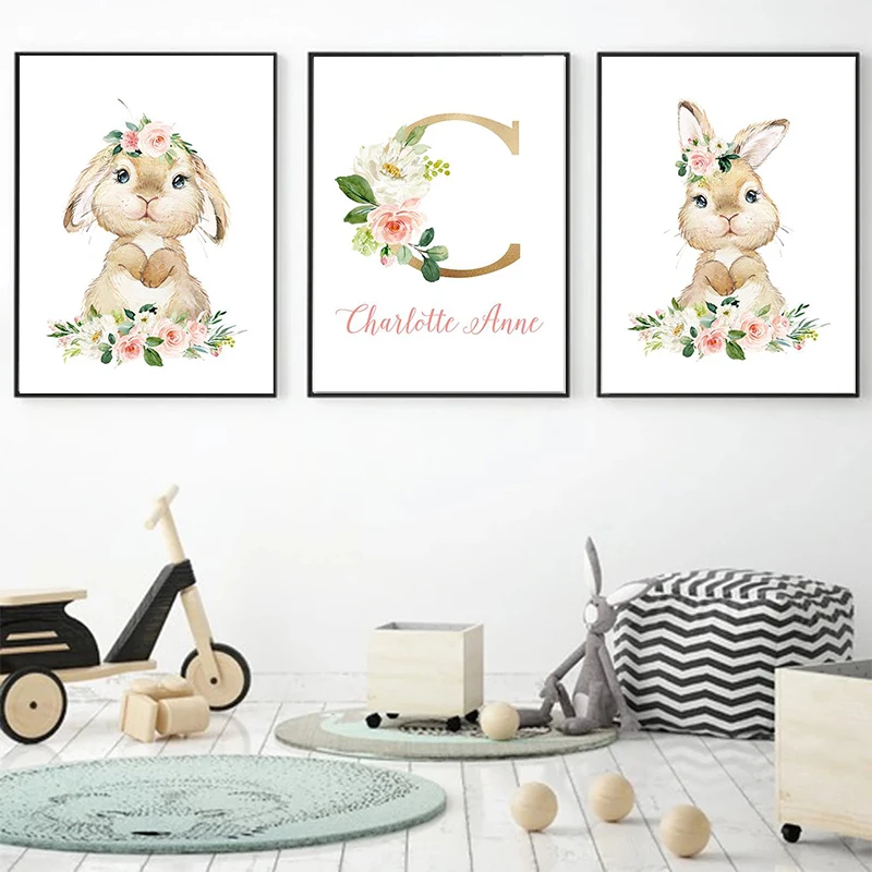 Мультяшные животные, кролик, холст, картина с именем на заказ, плакаты и принты, детская комната, цветок, художественная картина, печать, детская комната, настенное украшение