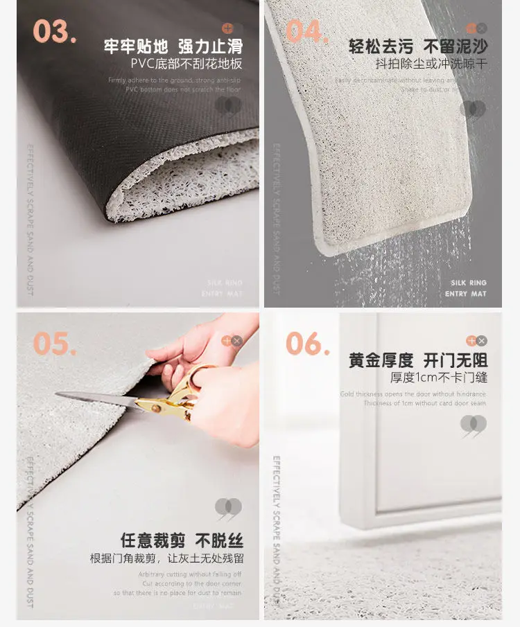 > Этот продукт может быть настроен в соответствии с размером входа, пожалуйста, свяжитесь с нами, если вам нужно настроить. > Он изготовлен из экологически чистого материала и безвреден для людей. > Подошва изготовлена из противоскользящего материала, чтобы предотвратить скольжение коврика и защитить вашу безопасность, верхний материал может поглощать влагу от обуви, чтобы сделать полы чистыми и сухими, также удалите пыль, грязь, снег и т. д. > Его можно свободно разрезать на любые формы, которые вы хотите, и он подходит для внутреннего и наружного входа, прихожей, гостиной, спальни, ванной комнаты и т. д. > Толщина составляет около 8 мм, он может полностью лежать на полу и не будет мешать открыванию и закрытию двери. > Когда он заполнен частицами грязи, вы можете просто очистить его с помощью пылесоса, или вы можете использовать садовый шланг в краску, а затем позволить ему полностью высохнуть на воздухе перед следующим использованием.