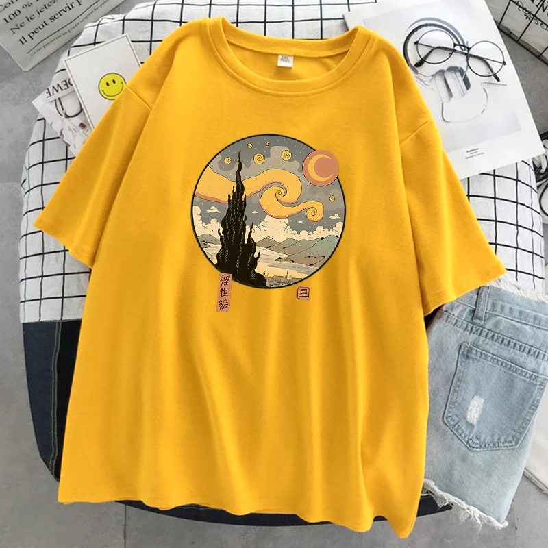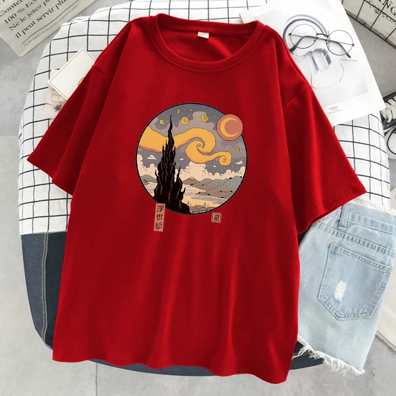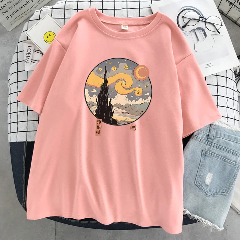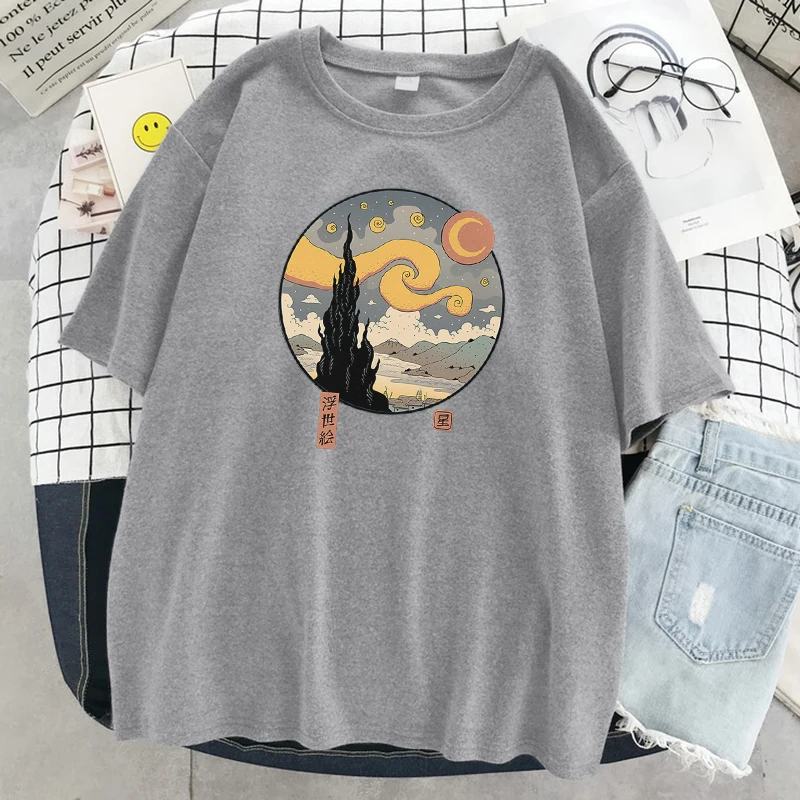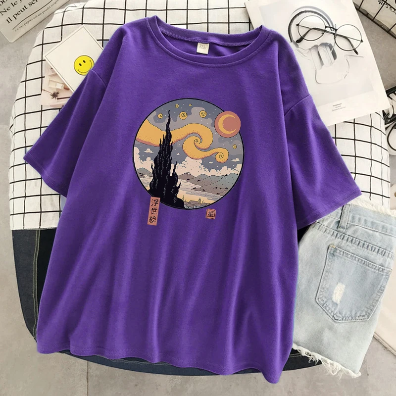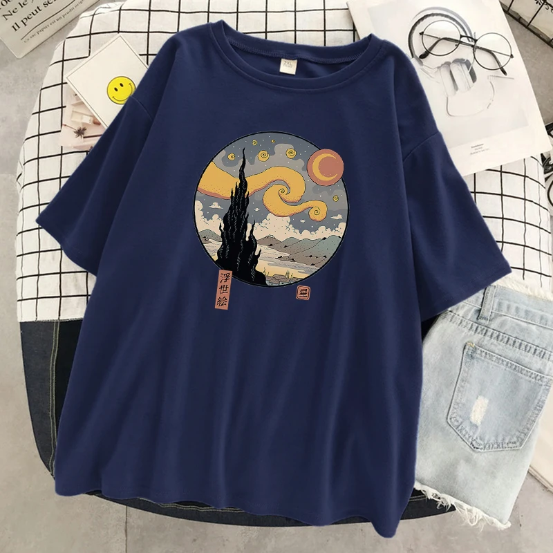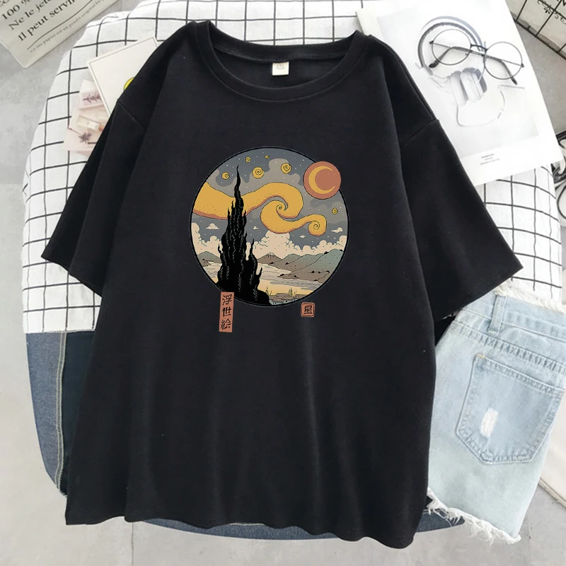 Женская футболка Starry Ukiyo-e Night японские комиксы, мягкие футболки с мультяшным принтом, удобная летняя свободная футболка, футболки в стиле хип-хоп с круглым вырезом