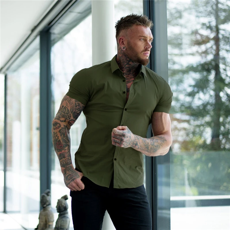 Рубашка мужская с коротким рукавом для бега, модная спортивная супер приталенная Деловая одежда, летняя одежда для фитнеса и спортзала