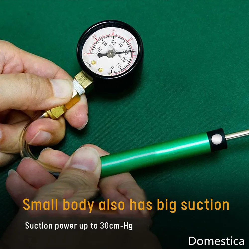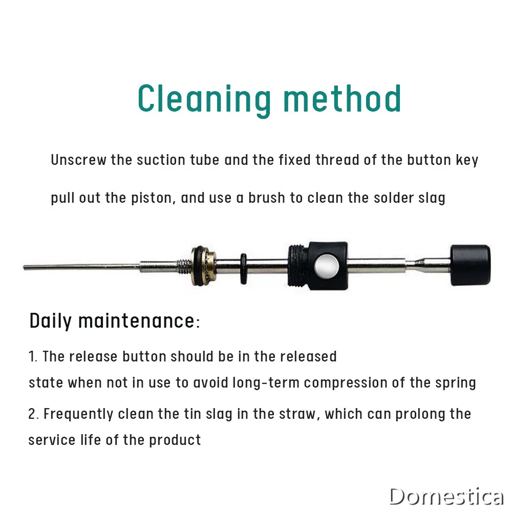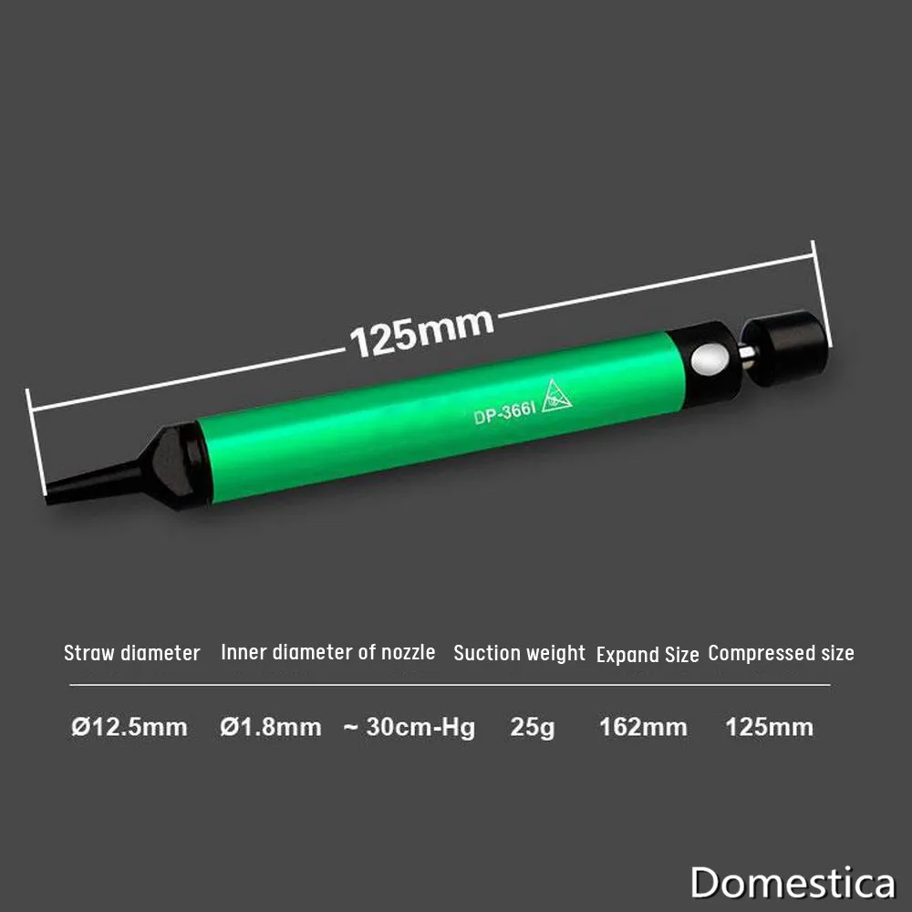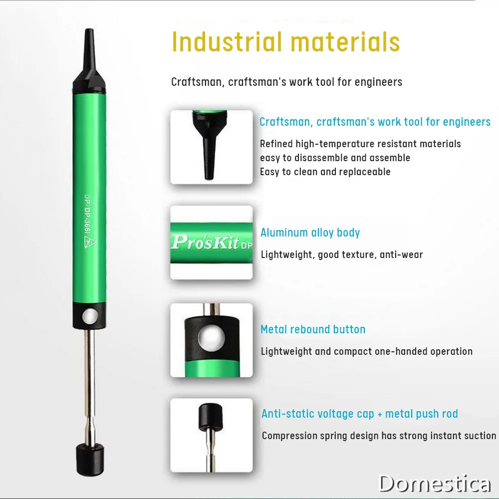 Особенности:-Изысканные Высокотемпературные материалы, легко разбираются, чистятся, легко заменяются.-Легкое и компактное управление одной рукой, простота в эксплуатации.-Сильное всасывание, конструкция пружины сжатия чрезвычайно сильна мгновенно.-Промышленные материалы, острый инструмент для мастеров и инженеров.