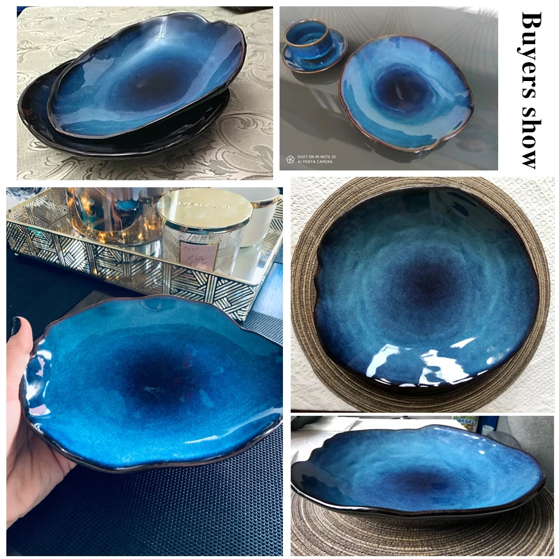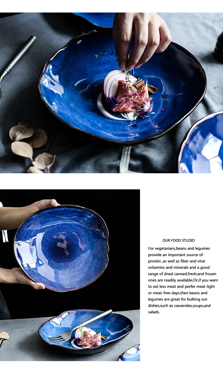 Европейская нестандартная керамическая тарелка в стиле ретро, голубая глазурь, западное обеденное блюдо, салатник, домашний ресторан, основная кухонная посуда