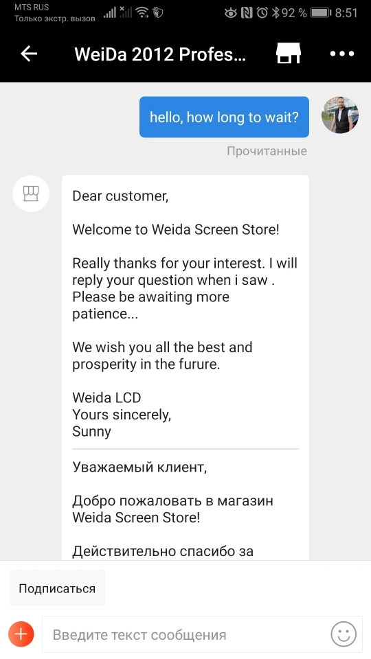 Дисплей пришел нерабочий. Продавец сказал что может вернуть деньги, если я отправлю товар обратно. Узнал стоимость отправки она равна почти половине стоимости дисплея. открыл спор, Алиэкспресс одобрил возврат меньше половины стоимости. Короче, по итогу: заказал дисплей за почти 4000, заплатил мастеру за установку, дисплей оказался не рабочим, теперь должен либо потратить ещё 1500 чтобы отправить нерабочий дисплей обратно и вернуть 4000, либо согласится на возврат 1400. В самом лучшем случае я на ровном месте в минусе на 2500, только поэтому что этот недопродавец не удосужился проверить дисплей перед отправкой. Ничего не покупайте у него, ему вообще на всё пофиг, в сообщениях вместо человека отвечает робот