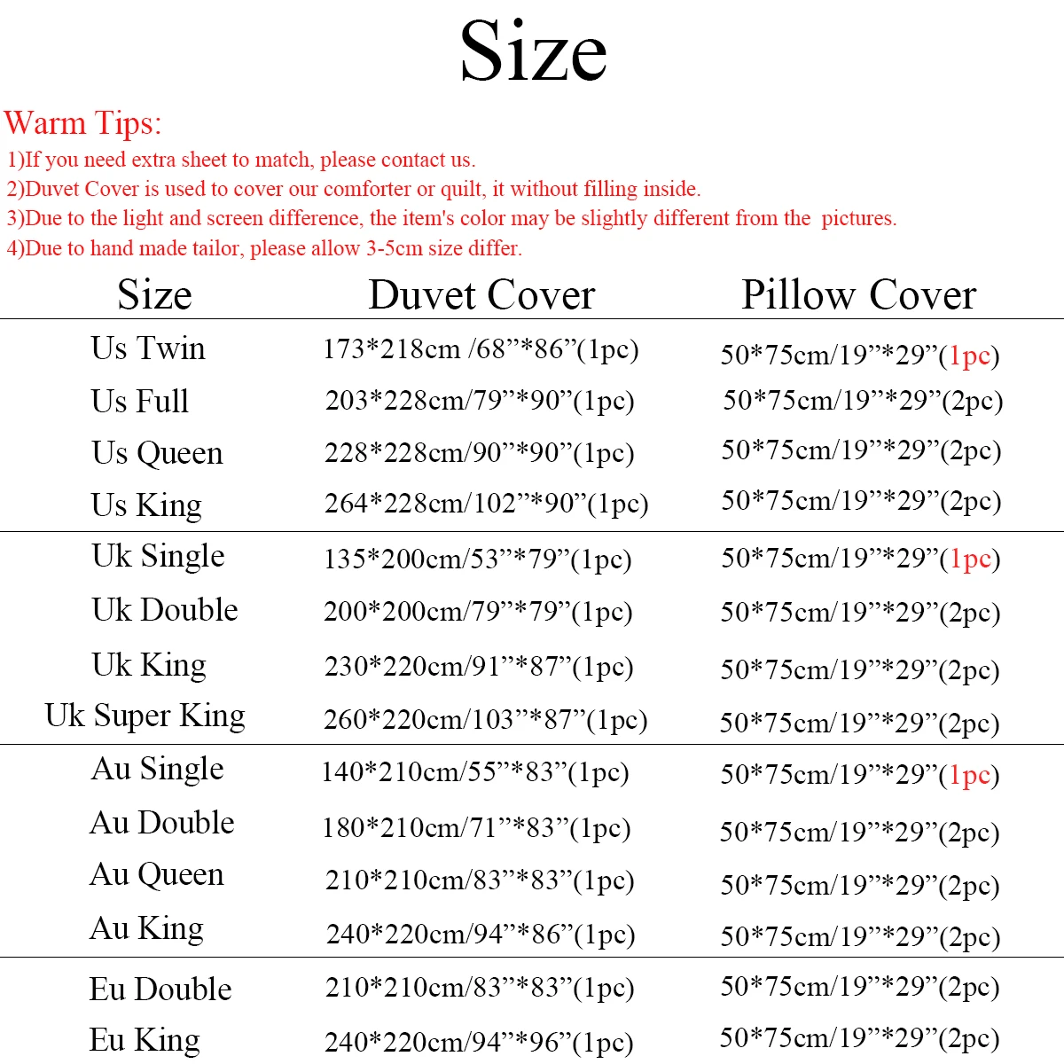 Наименование товара: Комплект постельного бельяУпаковочный лист: 1 * пододеяльник + 1 * наволочки/2 * наволочкиТкань: микрофибраСезон: весна, лето, осень, зимаОсобенности:Изготовлен из полиэфирной микрофибры, американский размер постельных принадлежностей, включает пододеяльник и наволочку,Тонкие швы, тонкая работа. Роскошная атмосфера,Рисунок верблюжьего цвета, яркий цвет, не выцветает, мягкий и удобный для кожи.Размер США:US Twin(2 шт.):1 пододеяльник 173x218 см (68x86 дюймов),1 Наволочка 50x75 см (20x30 дюймов).США (3 шт.):1 пододеяльник 203x228 см (79x90 дюймов),2 наволочки 50x75 см (20x30 дюймов).Королева США (3 шт.):1 пододеяльник 228x228 см (90x90 дюймов),2 наволочки 50x75 см (20x30 дюймов).Американский король (3 шт.):1 пододеяльник 228x264 см (90x102 дюйма),2 наволочки 50x75 см (20x30 дюймов).Размер Великобритании:UK Single(2 шт.):1 пододеяльник 135x200 см (53x79 дюймов),1 Наволочка 50x75 см (20x30 дюймов).UK Double(3 шт.):1 пододеяльник 200x200 см (79x79 дюймов),2 наволочки 50x75 см (20x30 дюймов).UK King(3 шт.):1 пододеяльник 220x230 см (87x91 дюймов),2 наволочки 50x75 см (20x30 дюймов).Великобритания Supking(3 шт.):1 пододеяльник 220x260 см (103x87 дюймов),2 наволочки 50x75 см (20x30 дюймов).Размер AU:AU Single(2 шт.):1 пододеяльник 140x210 см (55x79 дюймов),1 Наволочка 50x75 см (20x30 дюймов).AU Double(3 шт.):1 пододеяльник 180x210 см (71x83 дюйма),2 наволочки 50x75 см (20x30 дюймов).AU Queen(3 шт.):1 пододеяльник 210x210 см (83x83 дюйма),2 наволочки 50x75 см (20x30 дюймов).AU King(3 шт.):1 пододеяльник 220x240 см (87x95 дюймов),2 наволочки 50x75 см (20x30 дюймов).Европейский размер:Европейский двойной (3 шт.):1 пододеяльник 210x210 см (79x79 дюймов),2 наволочки 50x75 см (20x30 дюймов).EU King(3 шт.):1 пододеяльник 220x240 см (86x96 дюймов),2 наволочки 50x75 см (20x30 дюймов).Примечание: в комплект не входит одеяло/заполнитель для подушек.