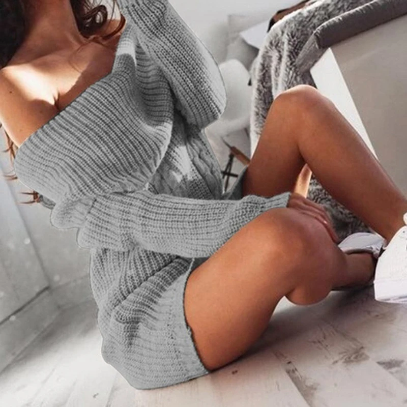Вязаное платье с открытыми плечами, женское платье-свитер с длинным рукавом, Женская осенне-зимняя свободная туника, вязаные повседневные однотонные платья
