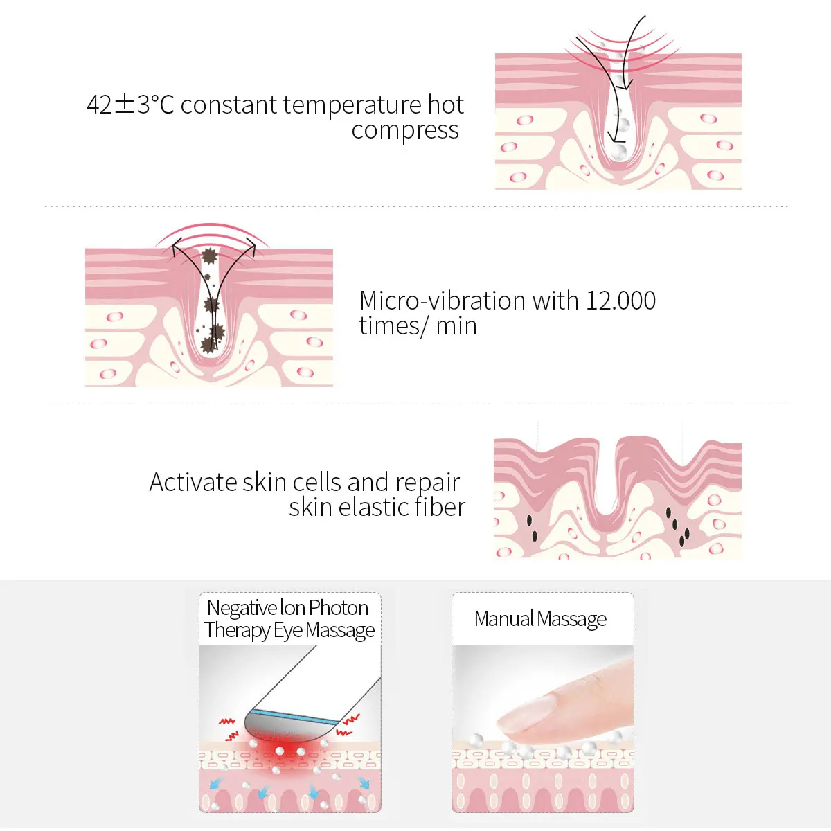 1) Теплый зонд, работающий с функцией вибрации, эффективно массирует кожу.2) Откройте поры для лучшего поглощения.3) укрепляет тепло и влагу кожи.4) эффективно удаляет морщины и мертвые кожи.
