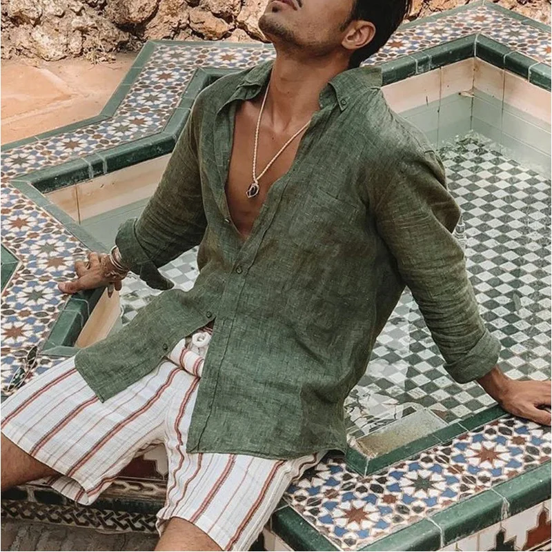 Мужская рубашка-поло из хлопка и конопли, Повседневная дышащая рубашка-поло с карманами, мужские льняные и хлопковые рубашки с длинными рукавами и пуговицами