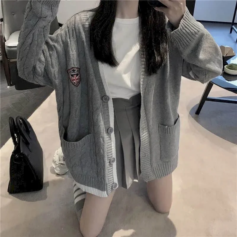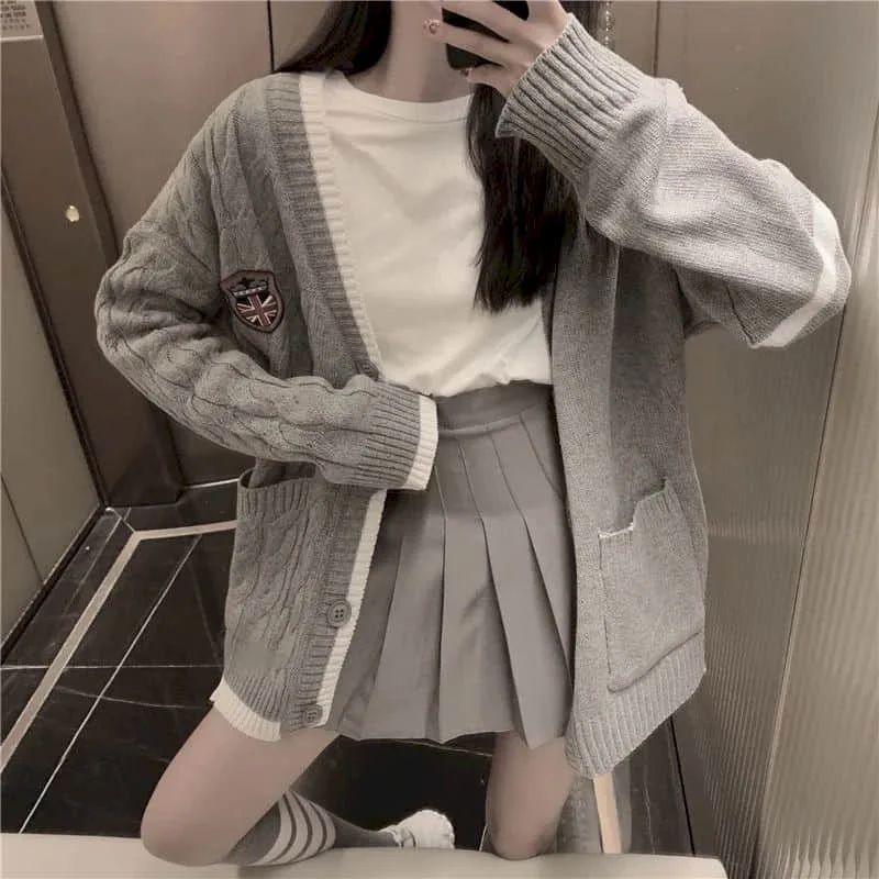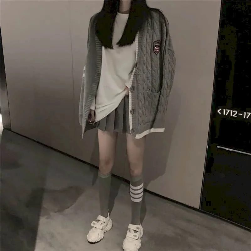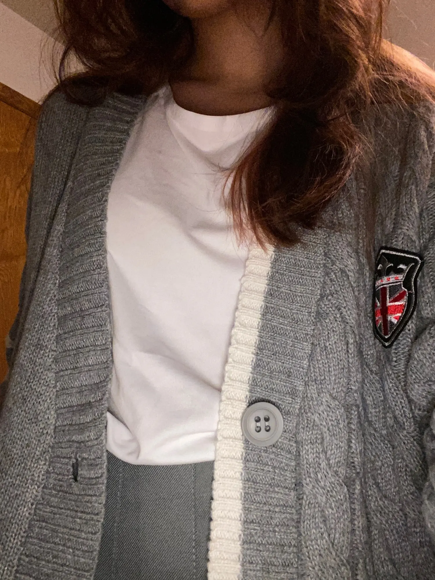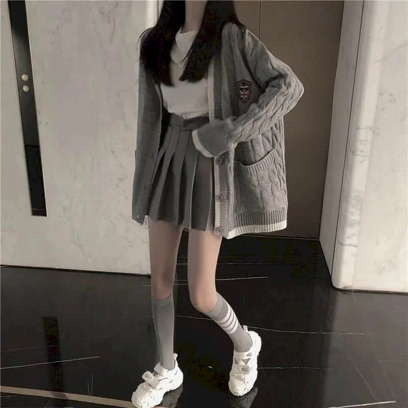 Вязаный свитер-кардиган, белая футболка с длинным рукавом и серая плиссированная юбка, костюмы-тройки в стиле преппи, весна-осень