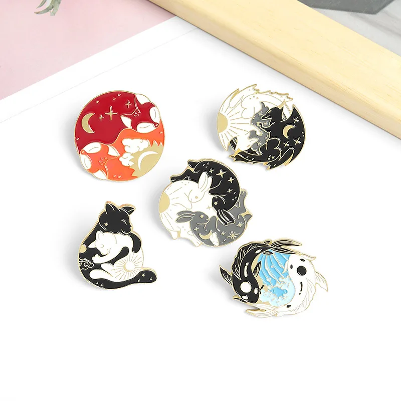 Эмалированные заколки для дня и ночи, индивидуальный значок с изображением солнца, луны, лисы, кои, кролика, летучей мыши, сумки, одежды, лацкана, значок, звездное животное, ювелирные изделия, подарок