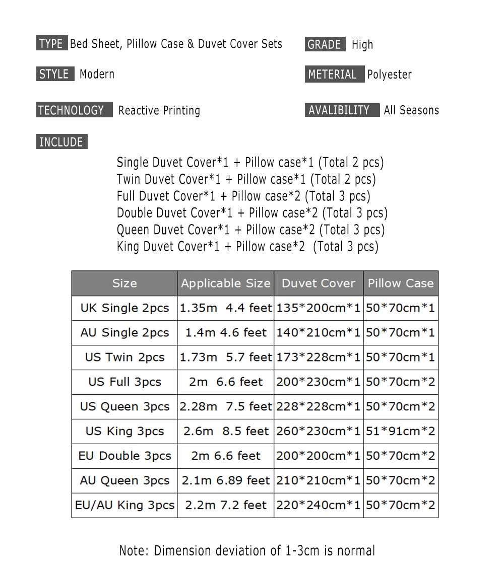 Пододеяльник (1 шт.):150X200 см = 59X79 дюймовНаволочка (1 шт.):50X75 см = 20X30 дюймов
