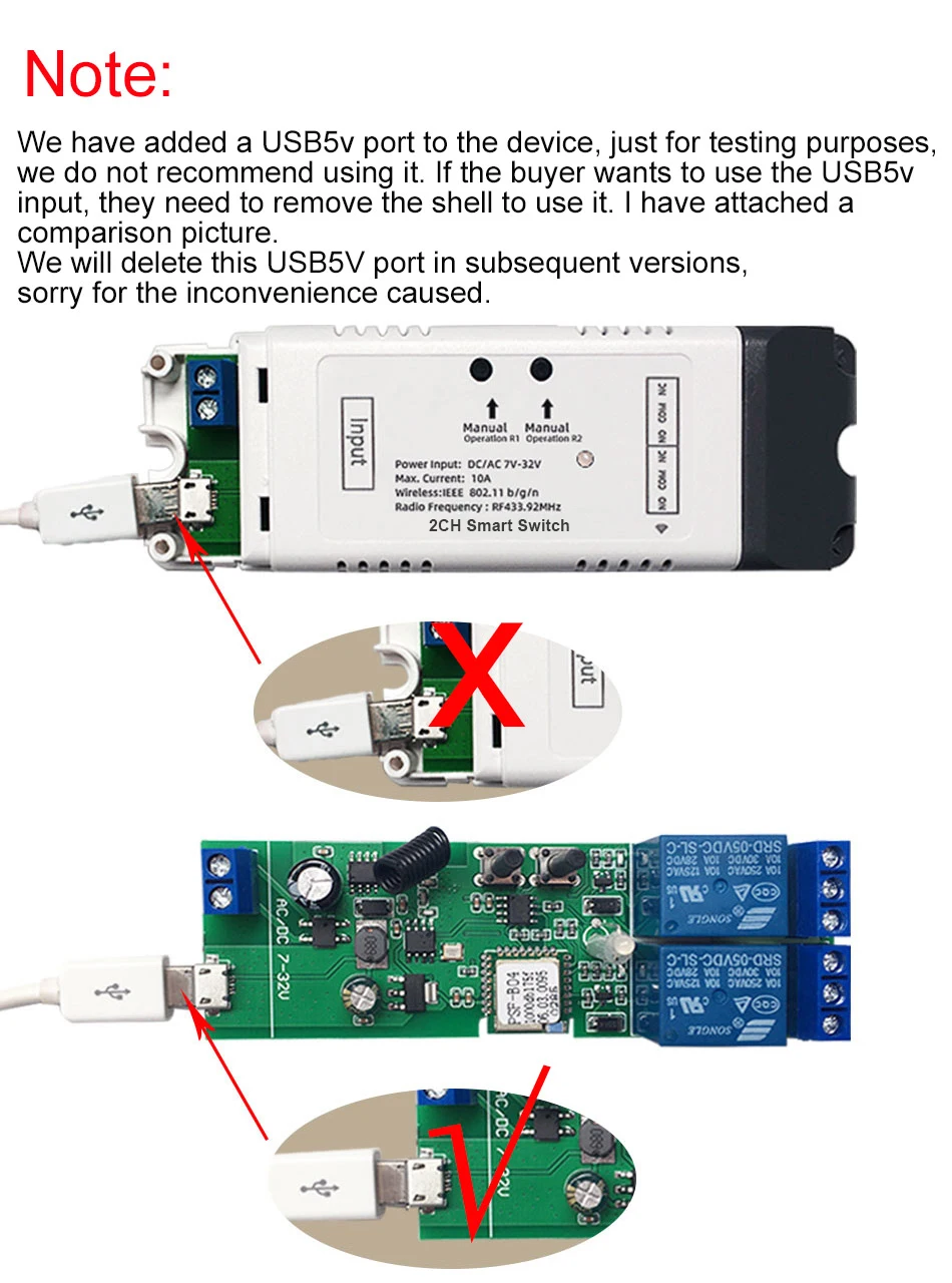 Мы добавили порт USB5v к устройству, только для тестирования, мы не рекомендуем использовать его. Если покупатель хочет использовать вход USB5v, он должен удалить корпус, чтобы использовать его. Я приложил фото сравнения.Мы удалим этот порт USB5V в следующих версиях, извините за причиненные неудобства.