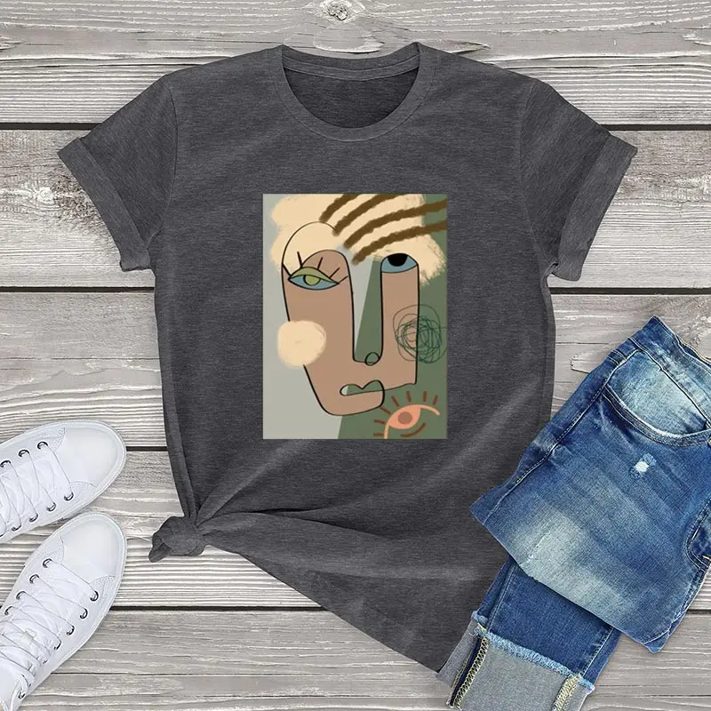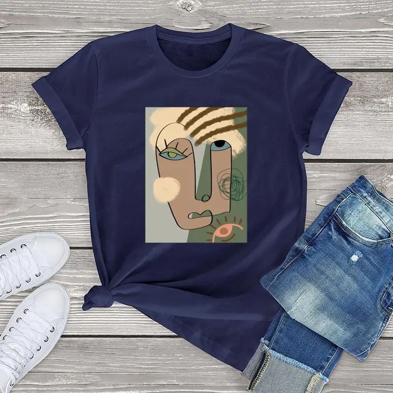 100 Хлопковое платье с абстрактным принтом Футболка женская летняя обувь 2021 новые свободные футболки повседневные свободные эстетическое модная одежда для маленьких девочек, комплект в стиле Харадзюку, модная верхняя одежда