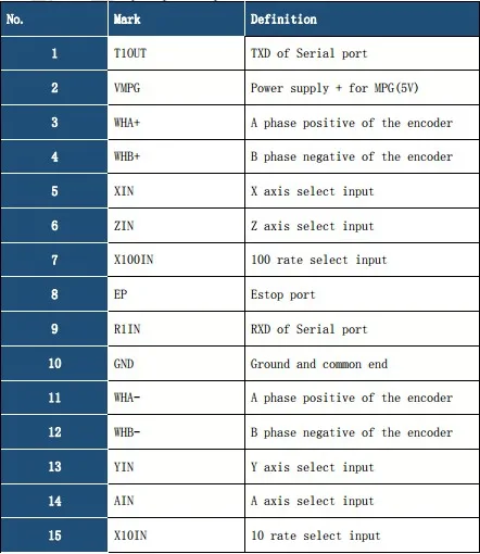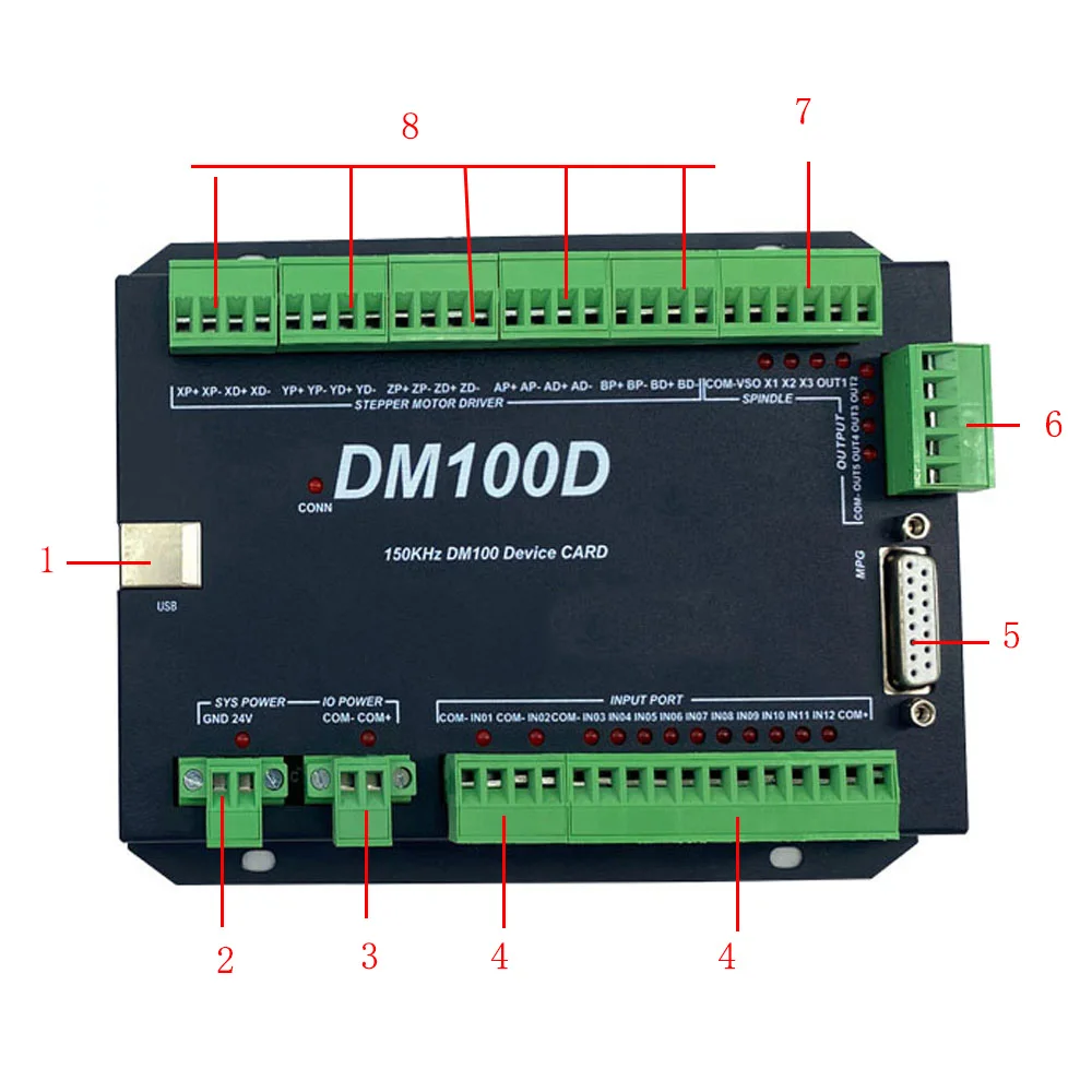 1. Интерфейс USB2. Основной интерфейс питания3. Входная и выходная мощность4. Входной интерфейс, такой как предельное происхождение5.MPG интерфейс6. Универсальный выходной интерфейс7. Выходной интерфейс управления шпинделем8. Интерфейс управления приводом