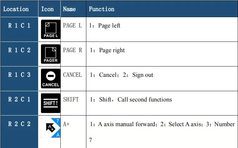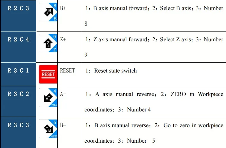 При использовании NCH02, где будет много английских сокращений, теперь мы перечислим всеИх для ваших любезных рекомендаций:FRO: Регулировка подачи: во время рабочего процесса, значение F уже установлено, и нужноОтрегулируйте скорость подачи, затем мы можем настроить значение FRO для реализации.SRO: регулировка скорости вращения шпинделя: во время рабочего процесса, значение S уже установлено, и нужноЧтобы отрегулировать скорость вращения шпинделя, мы можем отрегулировать значение SRO для реализации:Скорость тока S # = Настройка S * SRO.SRJ: регулировка скорости вручнуюВ процессе эксплуатации, так как ручная скорость уже установлена, и нам нужно отрегулироватьТекущая скорость, и невозможно зафиксировать значение во время работы, тогда мы можем изменить SRJЦенность для реализации.Текущая ручная скорость FS # = Настройка ручной скорости * SRJ.F: скорость подачи, блок мм/мин. Например F = 200, означает каждую минуту подачи2000 мм.S: Скорость вращения шпинделя. Единица измерения: rad/min. Например S = 20000, означает 20000 оборотов/минут.Координата оси XКоордината оси YКоордината оси ZКоордината осиКоордината оси BКоордината оси CReady:ReadyMode. В режиме мы можем сделать любую операцию, включая обработку или значенияИзменение или запуск второго режима.Сброс: режим сброса. В этом режиме он должен остановить каждую операцию.«Шаг»: ручной пошаговый режим. Каждая ось подсвечивает ручной шаг в этом режиме.MPG: MPG режим. Каждая ось может проводить MPG работу в этом режиме.