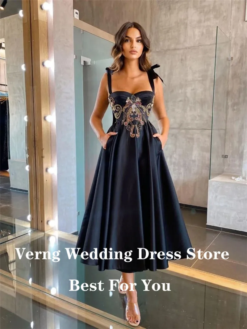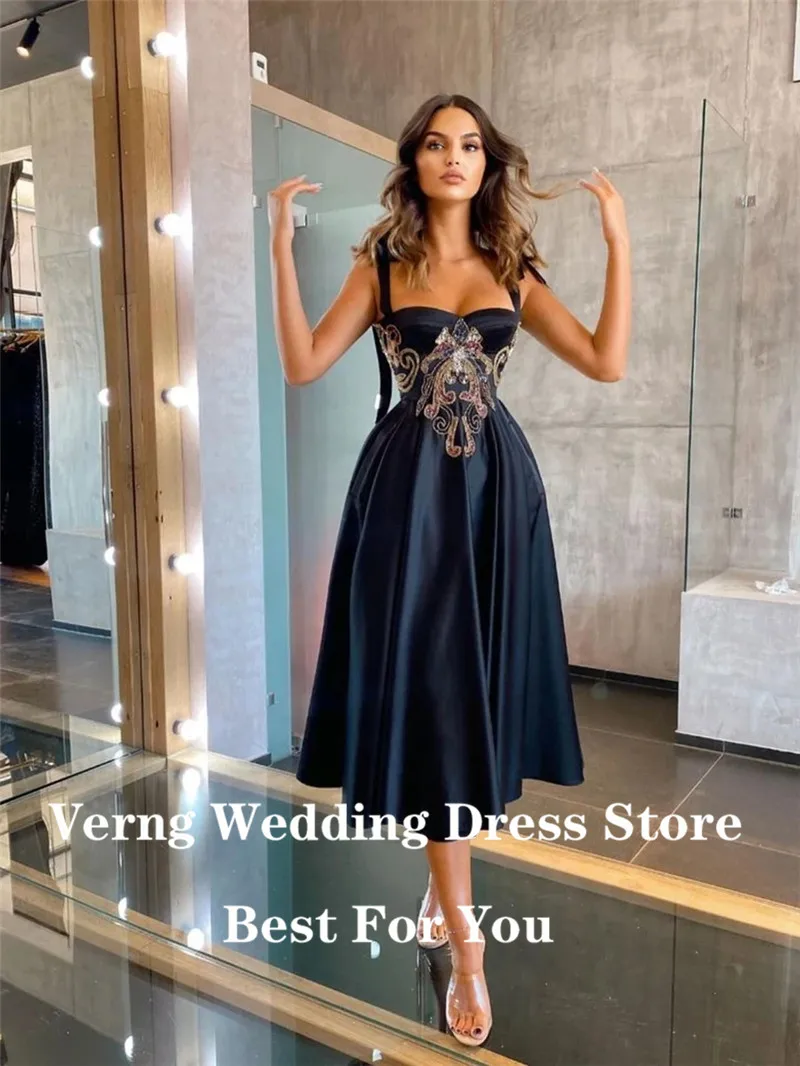 Темно-синее атласное короткое вечернее платье-трапеция Verngo 2021, вечерние платья с регулируемыми бретельками, платье до середины икры для выпускного вечера с аппликацией
