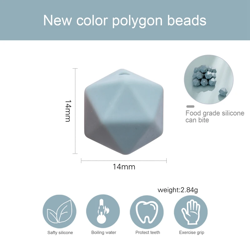 Название продукта: 14 мм многогранные Силиконовые Бусины Материал: пищевой силикон • Размер: 14 мм Вес: 10pcs30G Упаковка: 10 шт в пакете Подходящий возраст: 6-24 месяцев Цвет: синий, темно-фиолетовый, оранжевый, хаки, коричневый