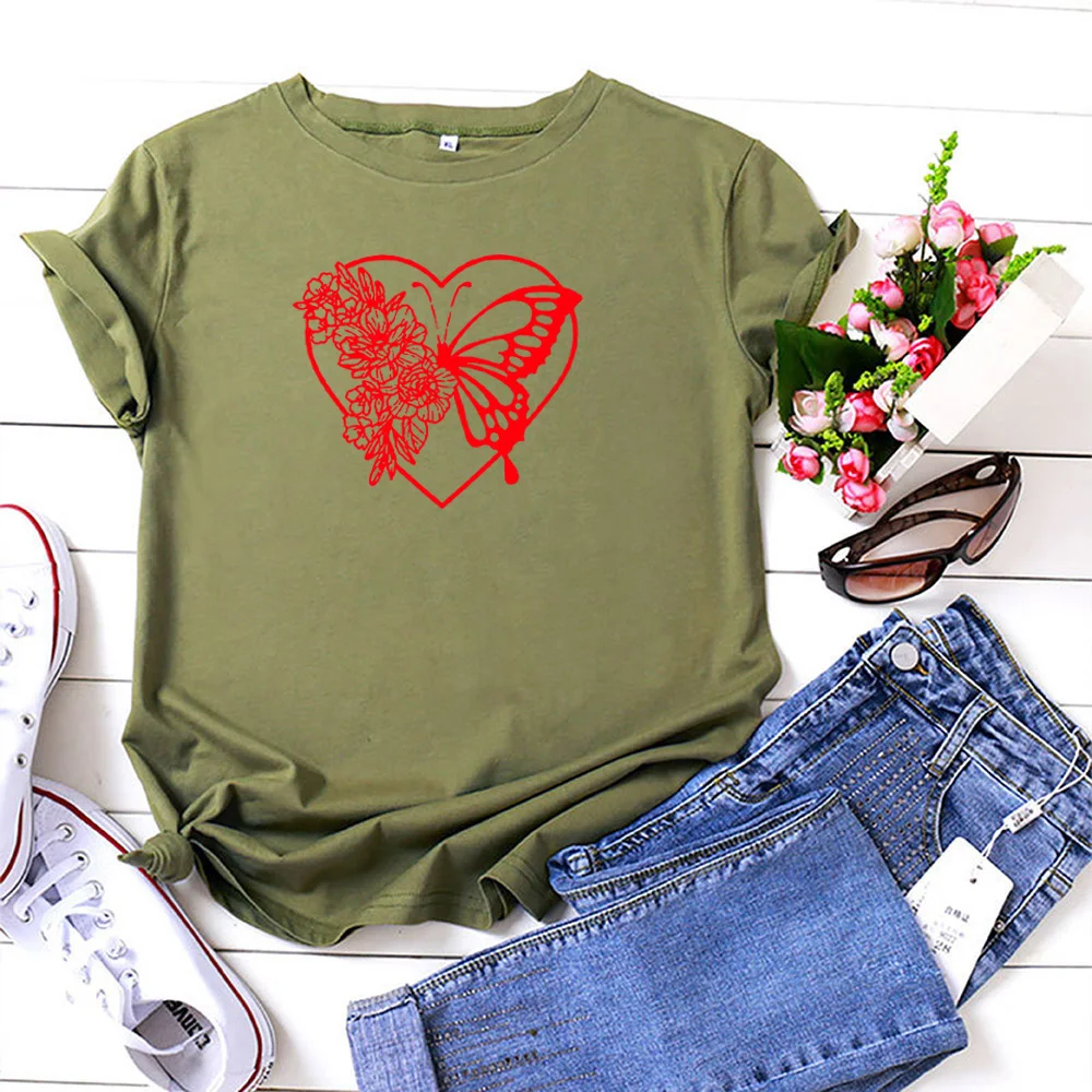 Футболка женская с коротким рукавом, простая рубашка с рисунком Красной бабочки и цветов, черный топ в стиле Харадзюку