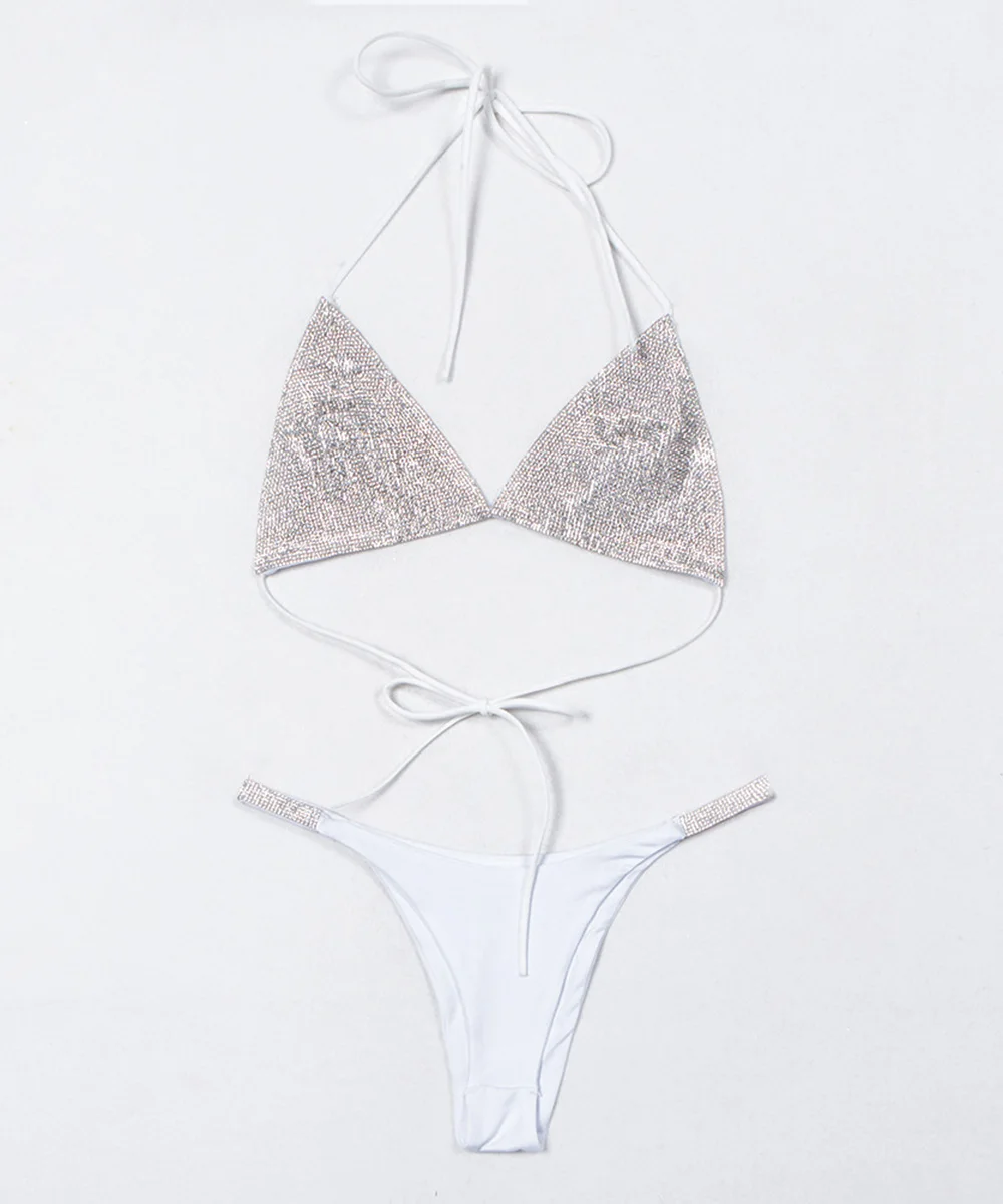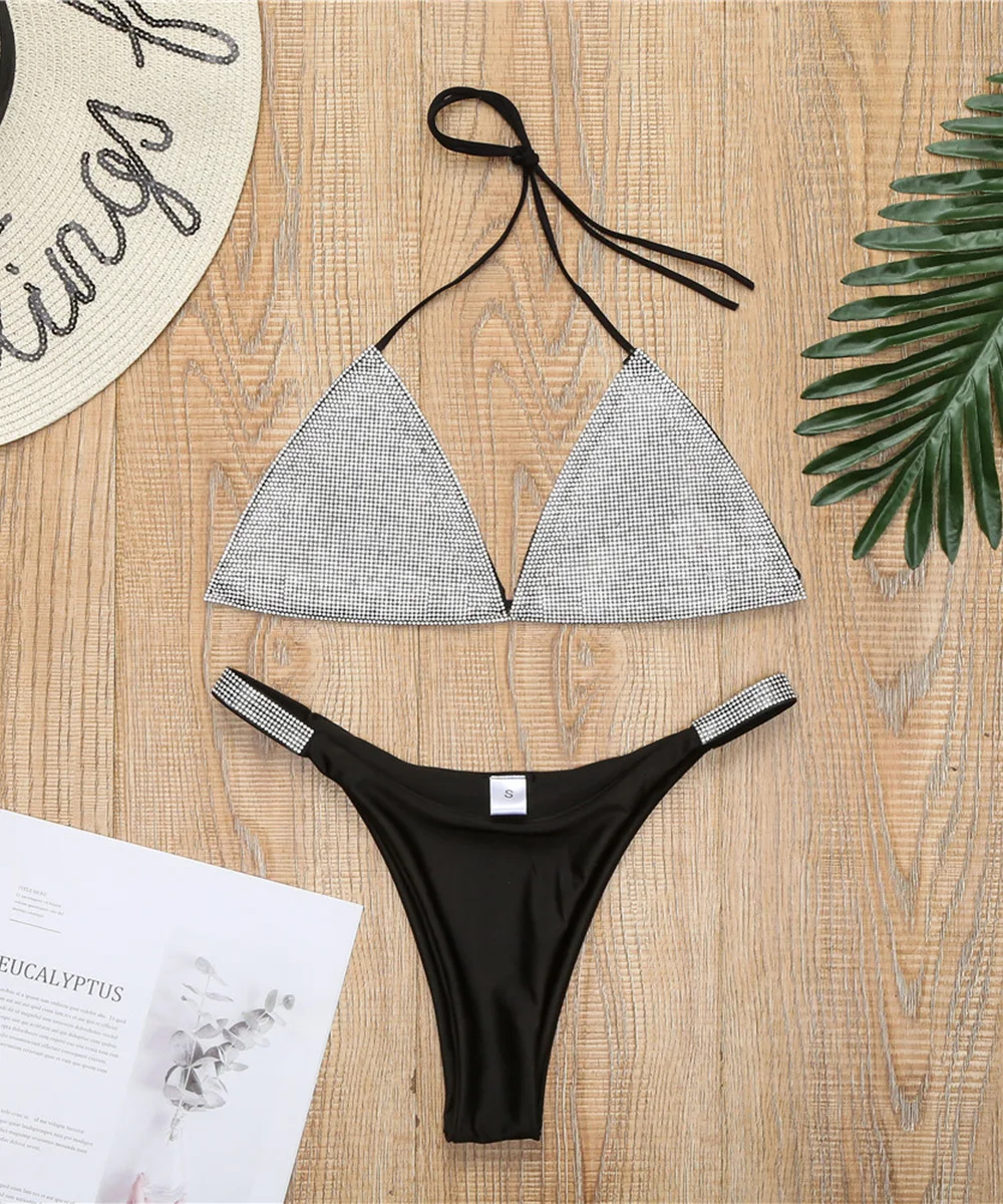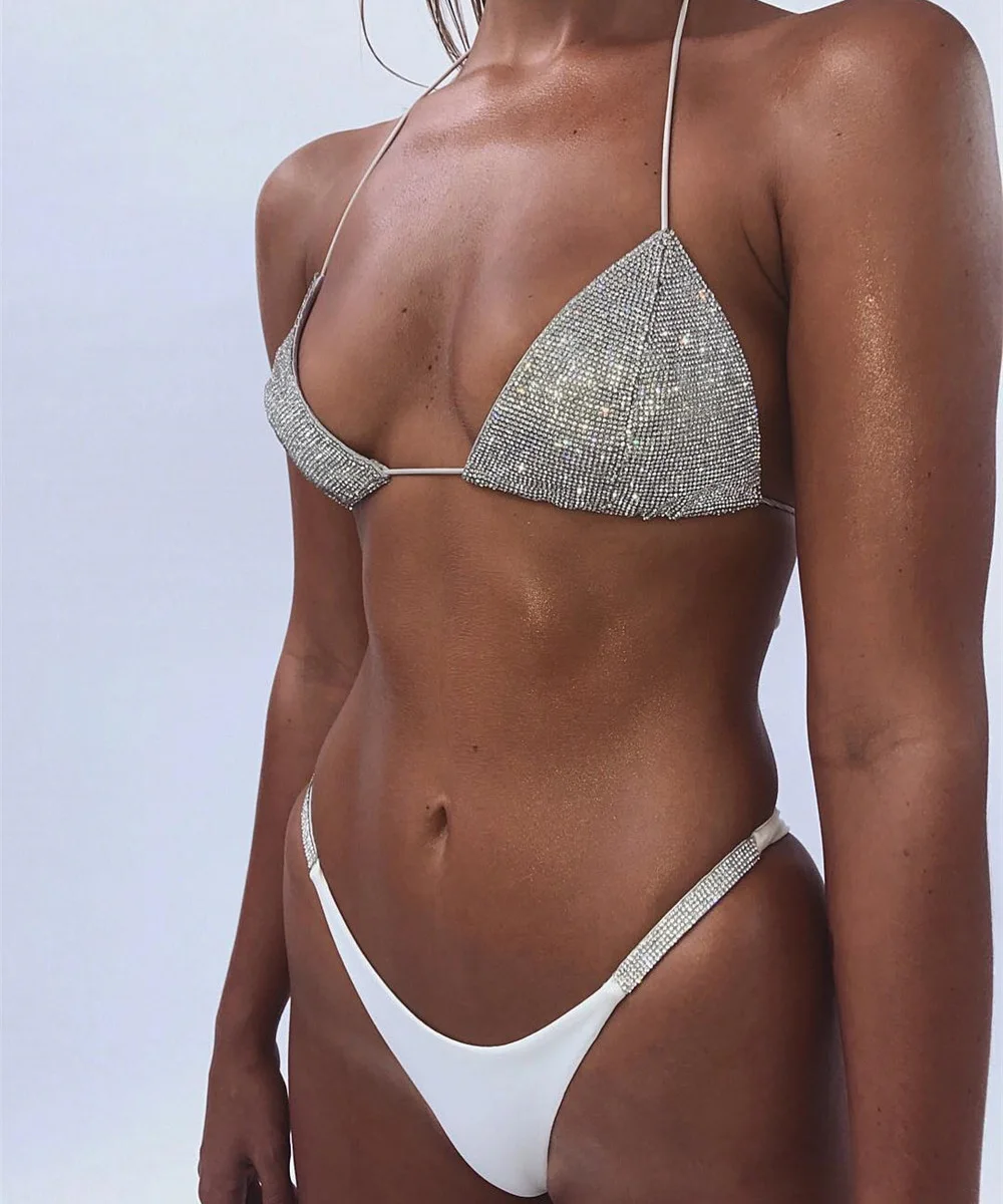 Роскошные блестящие стразы бикини серебряный комплект 2021 Кристалл бриллиант сексуальный женский купальник через шею пуш-ап бандажный Купальник бикини комплект