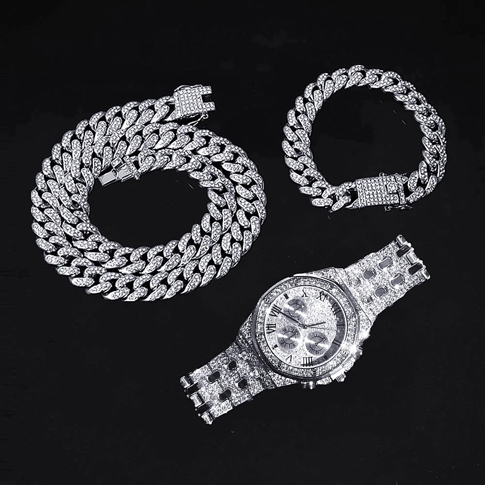 Часы мужские, 3 шт., браслет, ожерелье, хип-хоп, Майами, кубинская ...