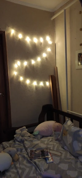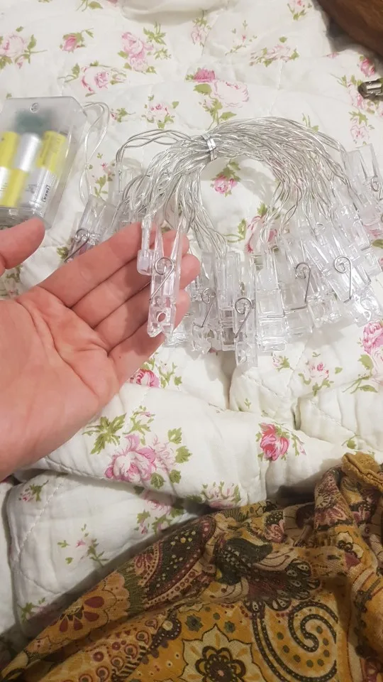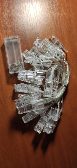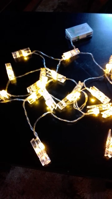 Всё отлично. Три пальчиковые батарейки. Мигающий режим как на дискотеке, никак не для спокойной обстановки в спальне, но пофигу, просто свет меня устраивает. Большие хорошие прищепки, добротно держатся на лампочках, не просто силиконовым пистолетом :) Todo perfecto. El modo parpadeo es un poco exagerado, pero la luz normal más que suficiente.
