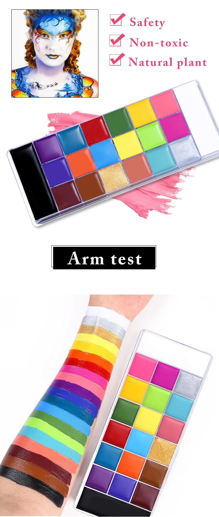 Особенности:Данные краски сертифицированы нетоксичными и не содержат вредных химических веществ. Безопасно наносить на кожу20 ярких цветов и 2 мерцающих оттенкаПодходит для любого типа художественного макияжа или раскрашивания спецэффектов.Цвета можно легко растушевать вместе, чтобы получить самые разнообразные эффекты.Лучше всего для создания сумасшедших образов! Таких как весёлая тематическая вечеринка, нарядное платье, Хэллоуин, карнавалы, фиеста;Это своего рода Рисование лица на масляной основе, а не на водной основе.Легко удалить:1. Используя водостойкое средство для снятия макияжа/оливковое масло для лица/кисти. (за счет этого оно на масляной основе, а не на водной основе.)2. Ожидание 5-10 секунд.3. Сначала протирайте бумажными полотенцами/ватными дисками/губкой.4. Смывание с помощью очищающего средства для лица.5. Мытье водой.6. Если не достаточно чистый, повторите его еще раз.