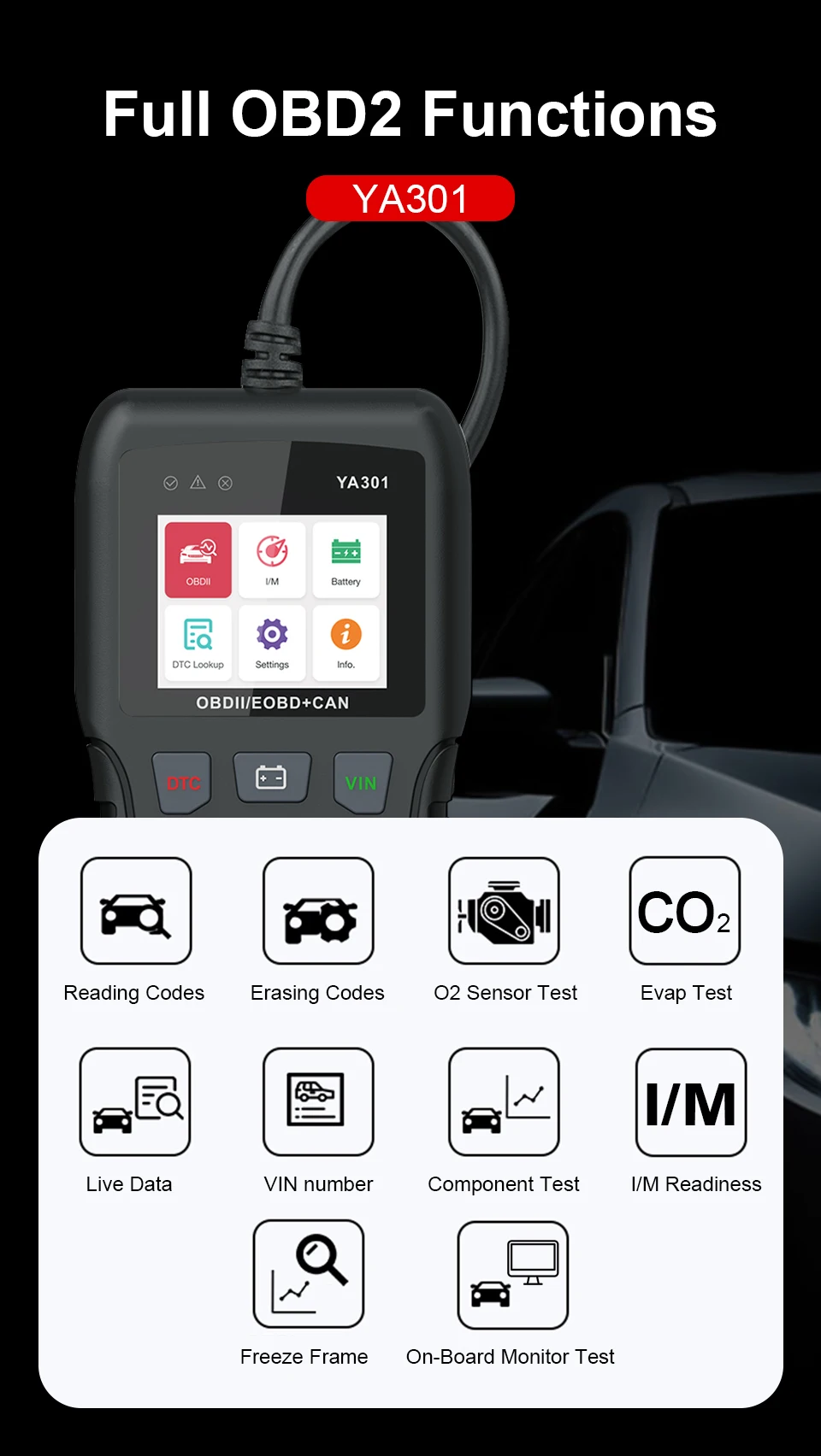 Диагностический инструмент для кодов неисправностей автомобиля, YA301, 12 В, полный набор функций OBD2, считыватель VIN, график, данные в реальном времени, выключение, проверка светильник двигателя