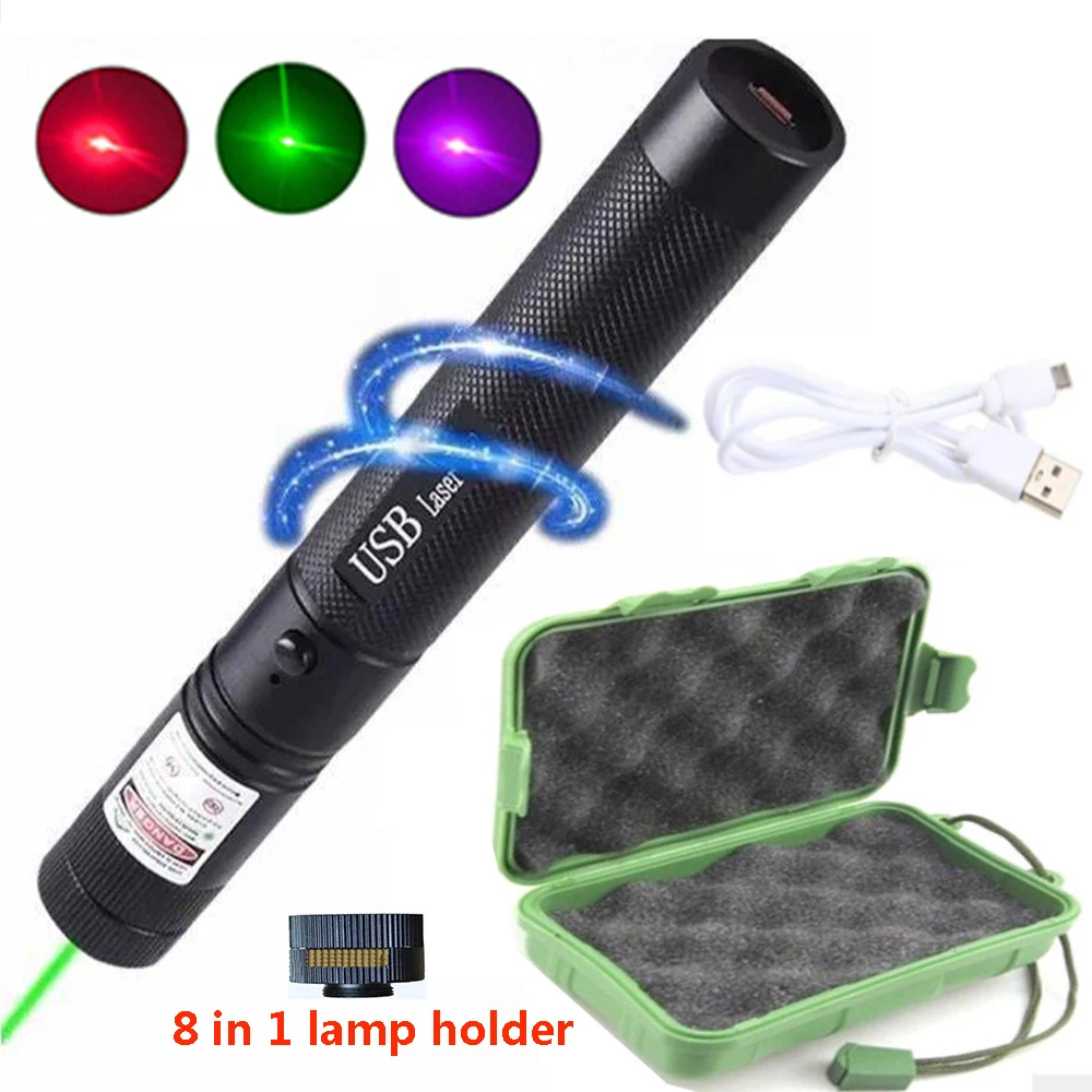 Мощная зеленая лазерная указка USB перезаряжаемая лазерная указка 8 в 1 держатель лампы 5 мвт высокомощная портативная красная фиолетовая лазерная указка