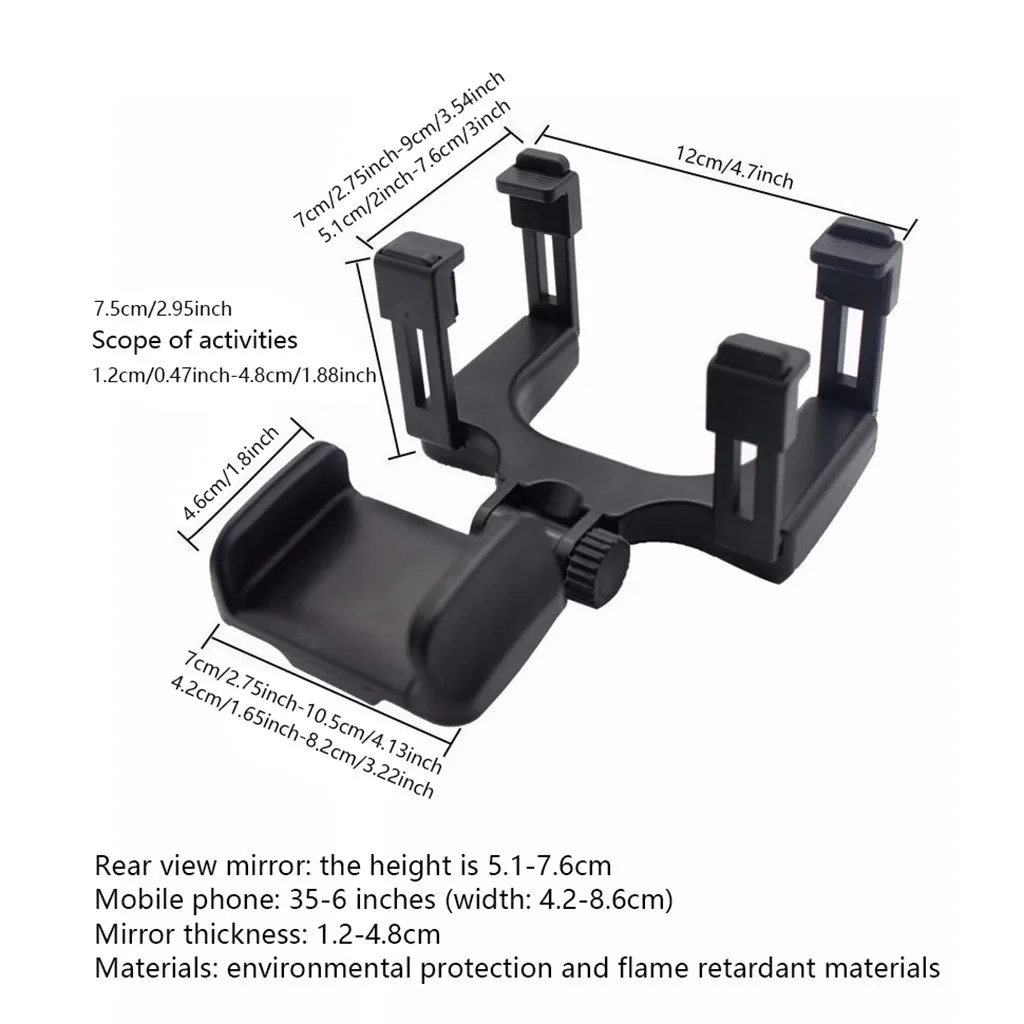 Тип устройства: Автомобильное зеркало заднего вида Зеркальный держатель Цвет: черный Материал: АБС-пластик Вес: 136 г Размер: 22x13x7.5см Подходит для телефона или другого Ширина устройства: 5-9 см Регулируемый зажим заднего вида Толщина: 1,8-5,0 cВ комплект входит: