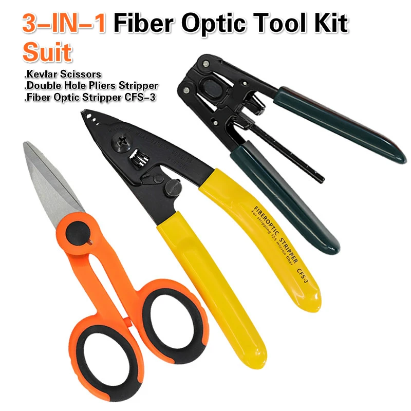 3 в 1 костюм продают 3 пакеты набор инструментов для оптического волокна кевлар ножницы + двойное отверстие клещи для зачистки кабеля + зачистки волоконно-оптического кабеля CFS-3