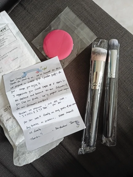 Очень хорошие кисти, плотно набитые, мягкие, качественно выполнены. Но самое приятное - это записка от продавца с личным обращением! Это было очень мило! Плюс в подарок пуховка для пудры.