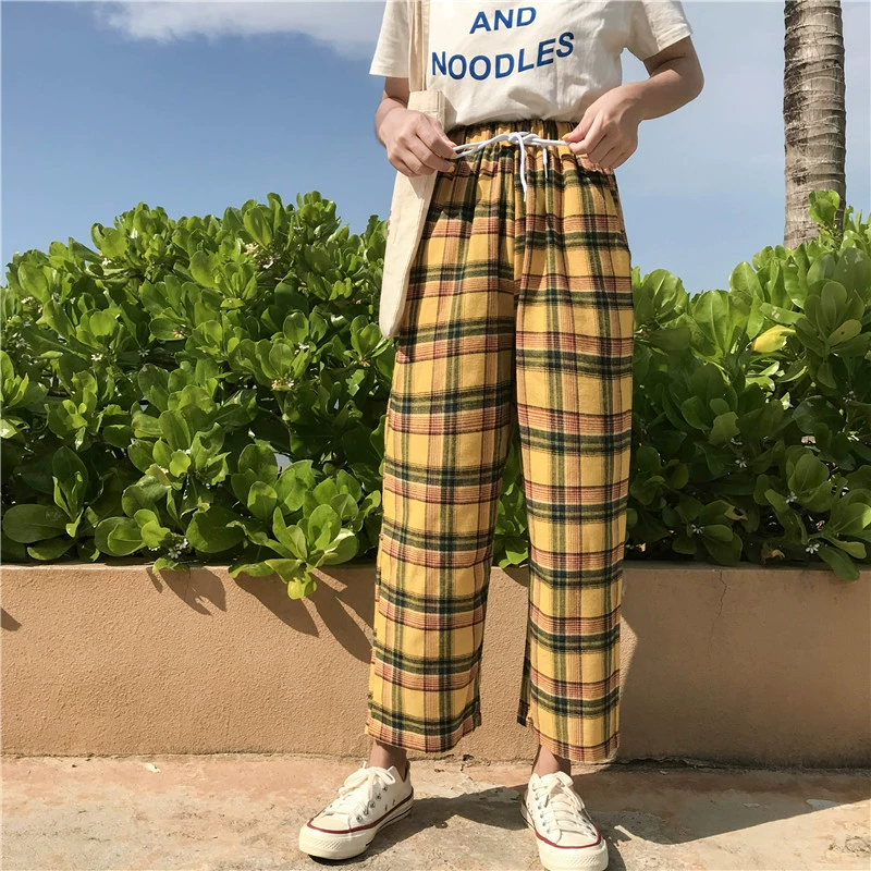 Желтые клетчатые винтажные брюки для женщин, весна-лето 2021, повседневные брюки на шнуровке, женские свободные хлопковые брюки с широкими штанинами