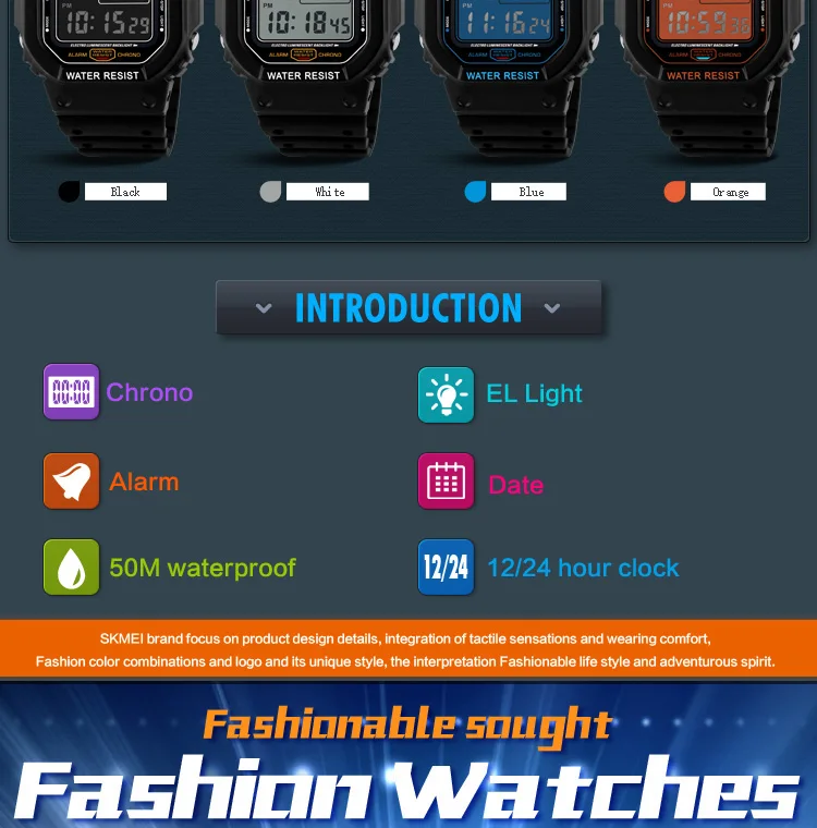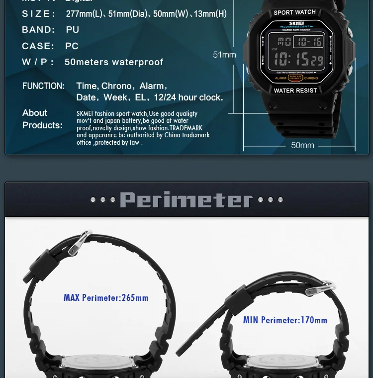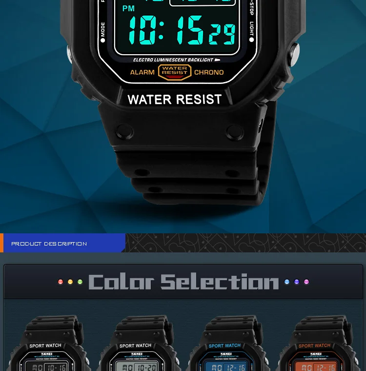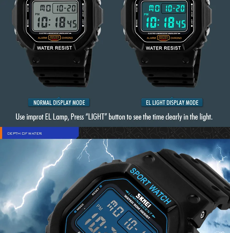 • Цифровые часы SKMEI 1134• Движение: цифровое движение• Стиль: спортивный и повседневный• Материал корпуса: пластик• Тип материала окна циферблата: смола• Тип материала ремешка: ПУ• Тип застежки: Пряжка• Особенности: Водонепроницаемость, отображение недели, ударопрочность, светильник ка, полный хронограф канлендара• Комплектация: 1 × цифровые часы (без коробки)