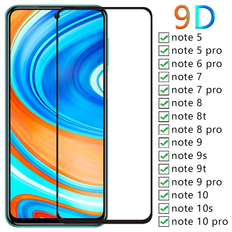 Защитное стекло 9d для экрана redmi note 9s 10s, 9t, 8t, 5, 6, 7, 8, 9, 10 pro