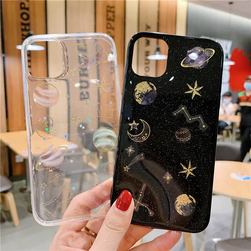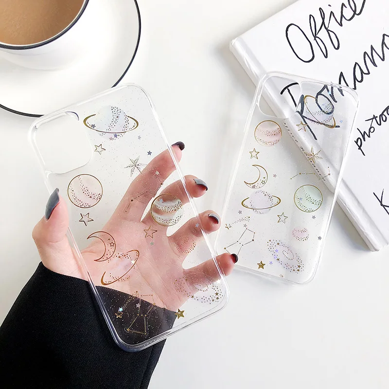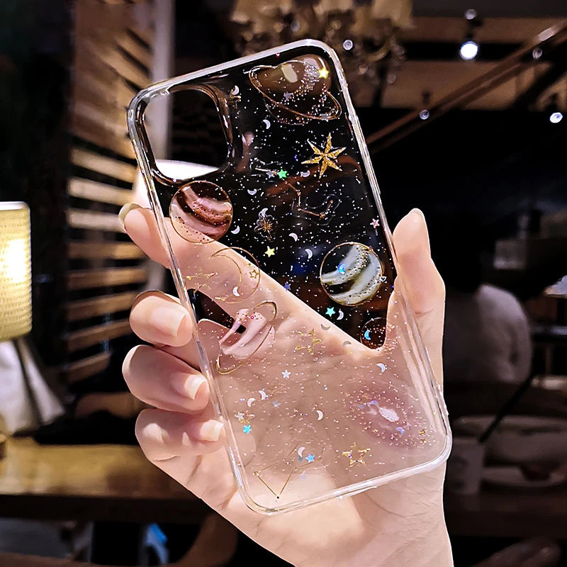 Прозрачный чехол для телефона с блестящими планетами, звездами, Луной для iPhone 13, 12, 11 Pro, XS Max, Mini, XR, 6S, 7, 8Plus, SE2, блестящий мягкий чехол-накладка из ТПУ с блестками