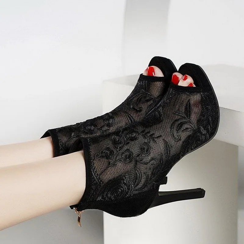 Женские босоножки с вышивкой и открытым носком, летние модные дышащие сетчатые босоножки с цветочной вышивкой, женские кружевные ботинки на высоком каблуке, 2021