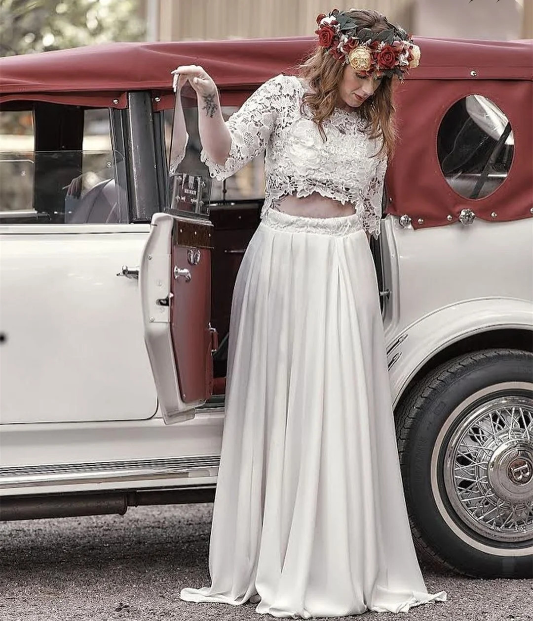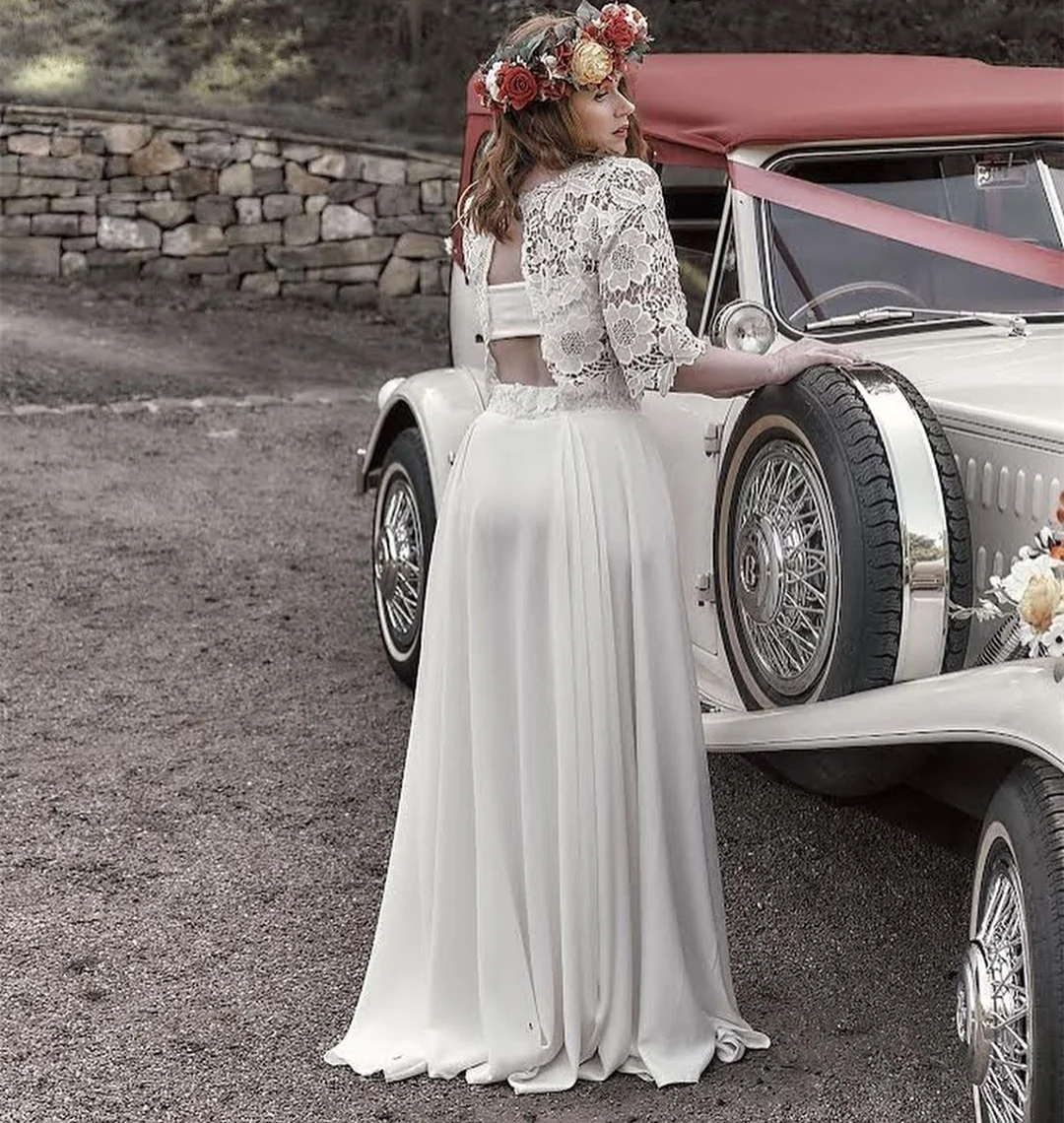Винтажные богемные искусственные трапециевидные 2021 кружевные шифоновые Свадебные платья из двух частей женское пляжное свадебное платье в стиле бохо для