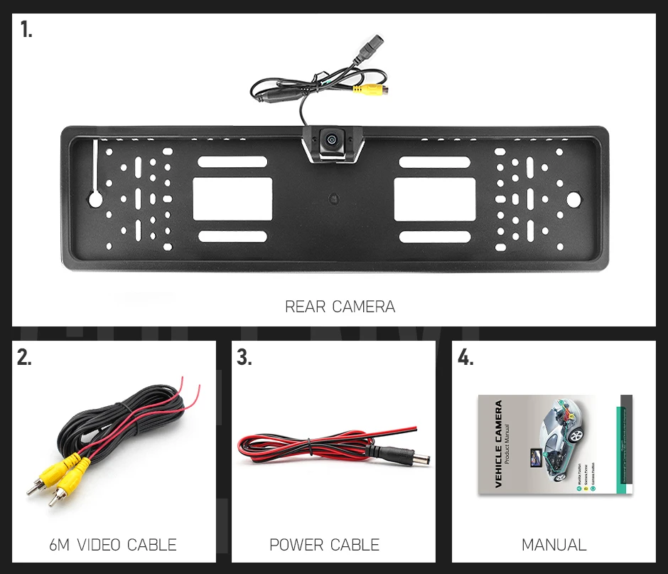 рамка крепкая пластиковая, это хорошо, но не предусмотрено как закрепить сам знак... только на саморезы. Провод от камеры выходит снизу рамки и ею же придавливается, если не сделает самому канавку в рамке. На счёт камеры вопросов нет, качество отличное, угол обзора шикарный.