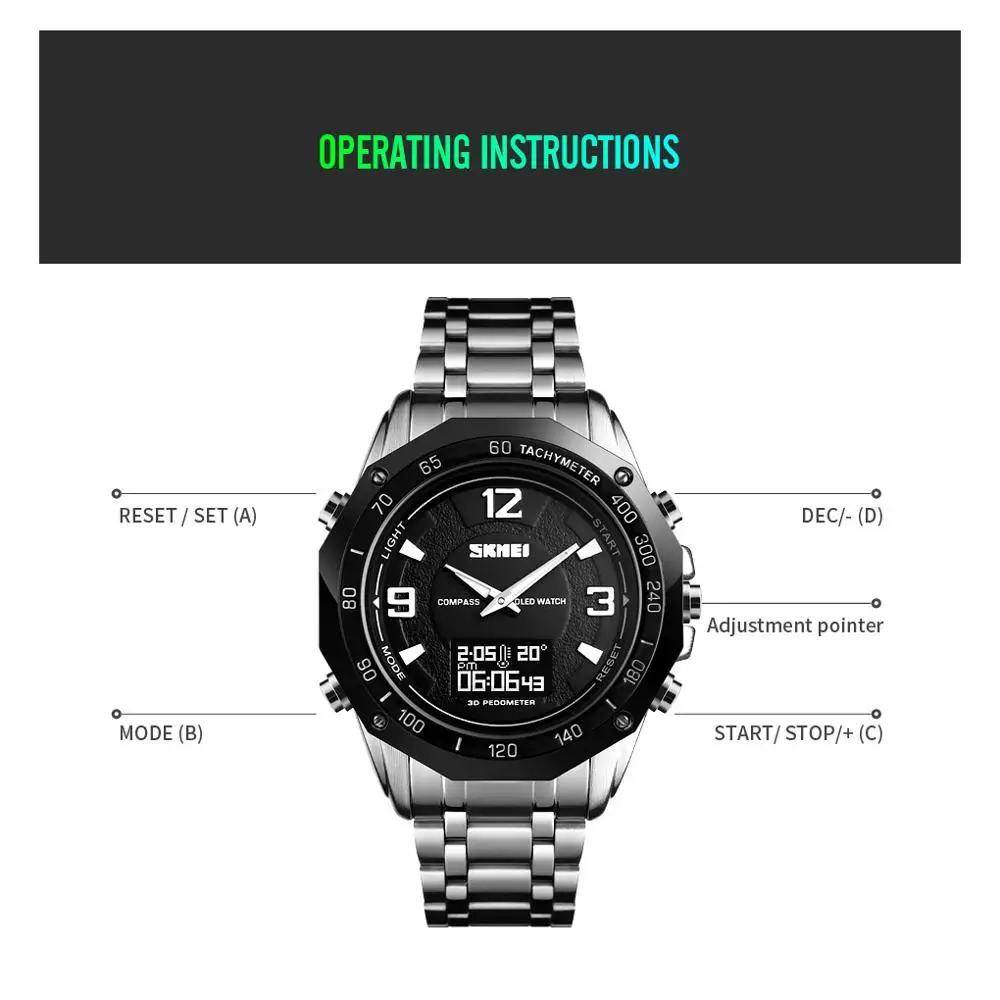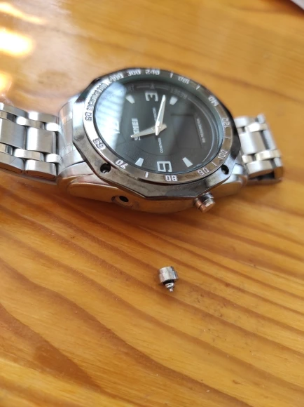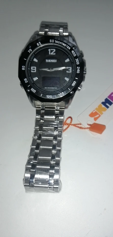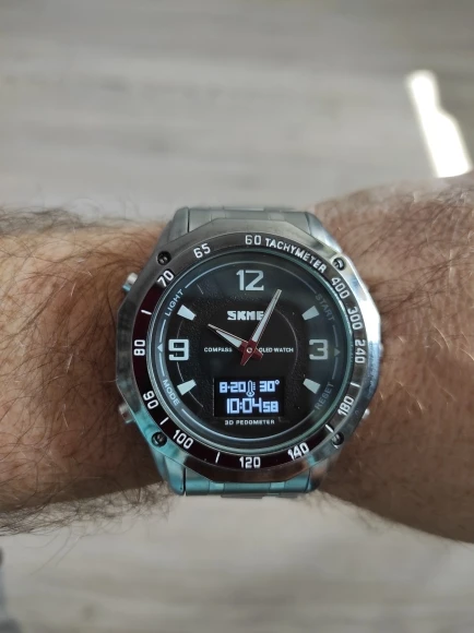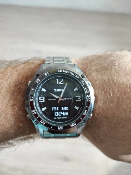 Часы хорошие. На 4+. Искал себе подобие Casio Illuminate. Casio отпахали почти 15 лет. Два раза клееный крепеж и износ прокладки таки задолбали меня. Раньше нырял и плавал в них, сейчас даже руки не помыть. Вообщем 15 лет это срок. Искал нечто подобное. Вроде как нашел. Итак плюсы.Корпус приличный, большой, тяжелый. На руке смотрится отлично. Настройка чуток мудреная, но инструкция в комплекте хорошая. Почти идеал. Внешний вид не замылен. Минусы. Кусачий браслет. Волосы рвет и закусывает постоянно, думаю заменить на браслет от Casio . Нет подсветки. Вообще. Вместо подсветки просто включается электронное табло. Вроде как и логично, но привычка иметь и освещенное табло и дисплей наверно сильнее. Стрелки ночью не светятся, хотя заявлено что покрыты спецслоем. Те 10 сек света, что удается наблюдать после дневного нахождения под солнцем не считаются. Типа юзайте Led экран. И на том спасибо. В остальном четко все. Брать можно, но с заменой ремешка. Доставка 2 недели в Самару.